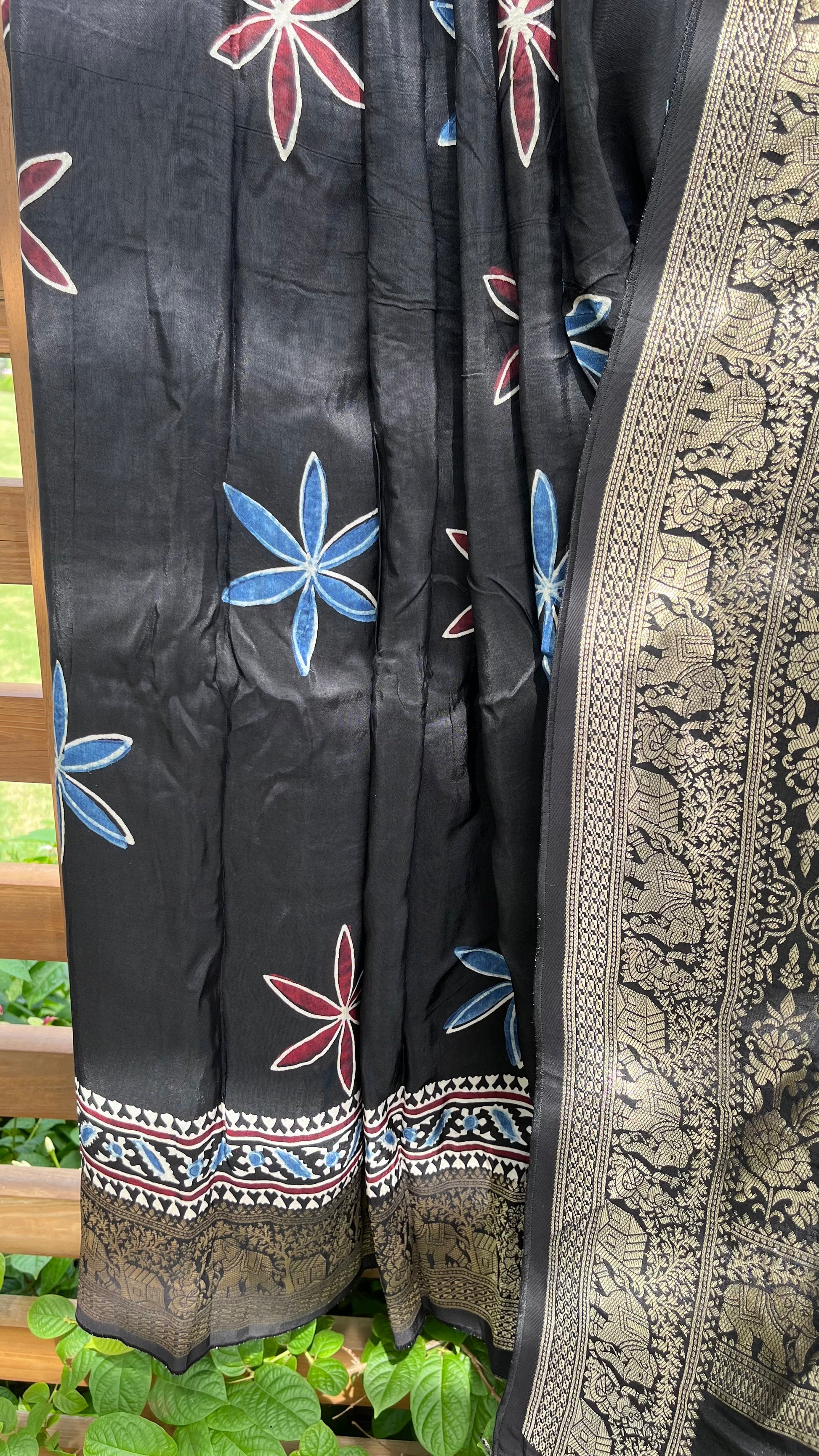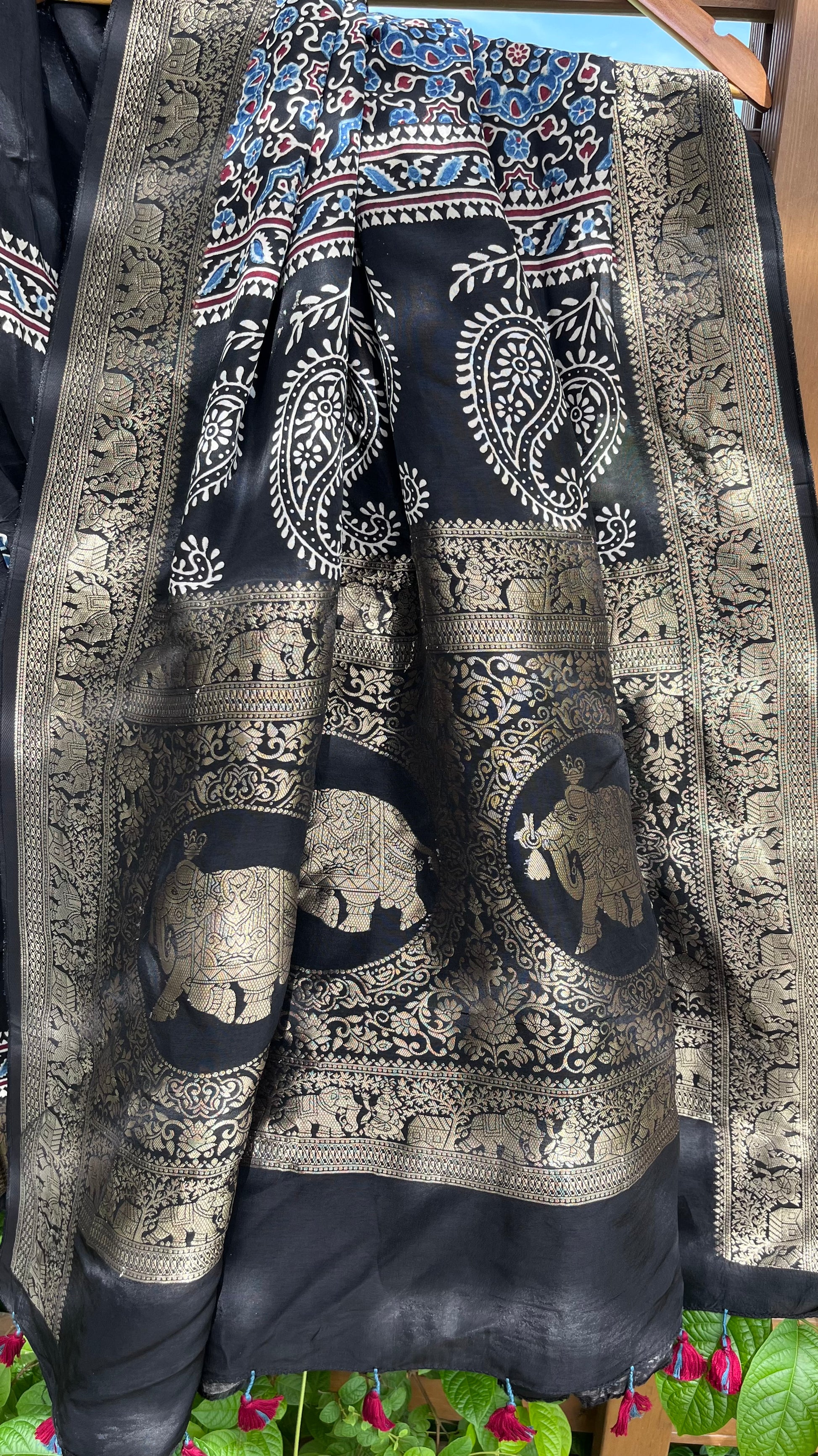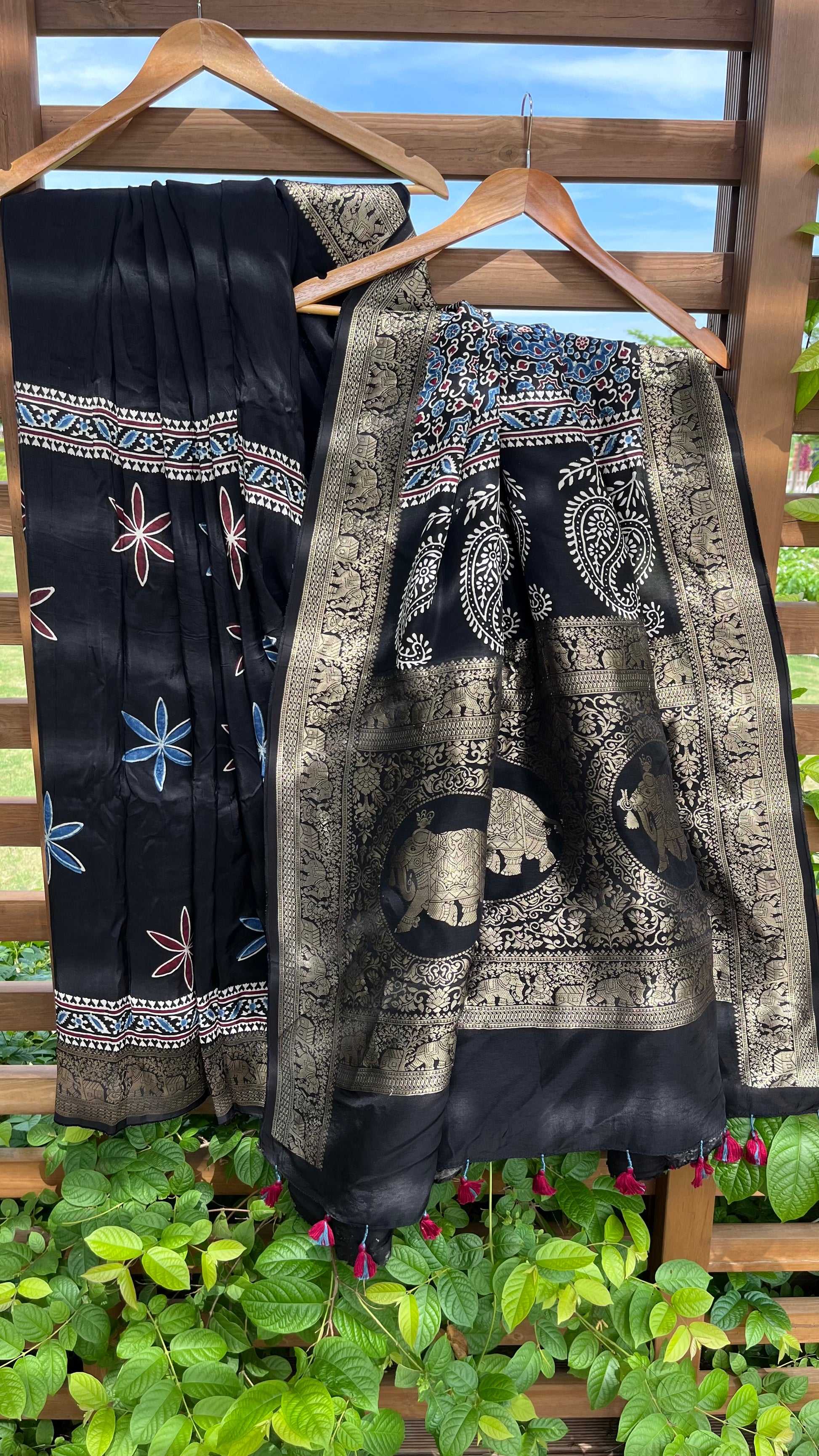 Our entrancing collection of authentic handcrafted Ajrakh modal silk sarees are an outcome of nature made with absolute love and patience. Handcrafted with vegetable dyes, the craft of Ajrakh hand-block printing is practised by the artisans in Kutch region of Gujarat. These eye pleasing modal silk ajrakh sarees immerse you with grace, poise and helps you stand out from the crowd. Each saree comes with a matching blouse piece. Thank you for looking and supporting handmade!