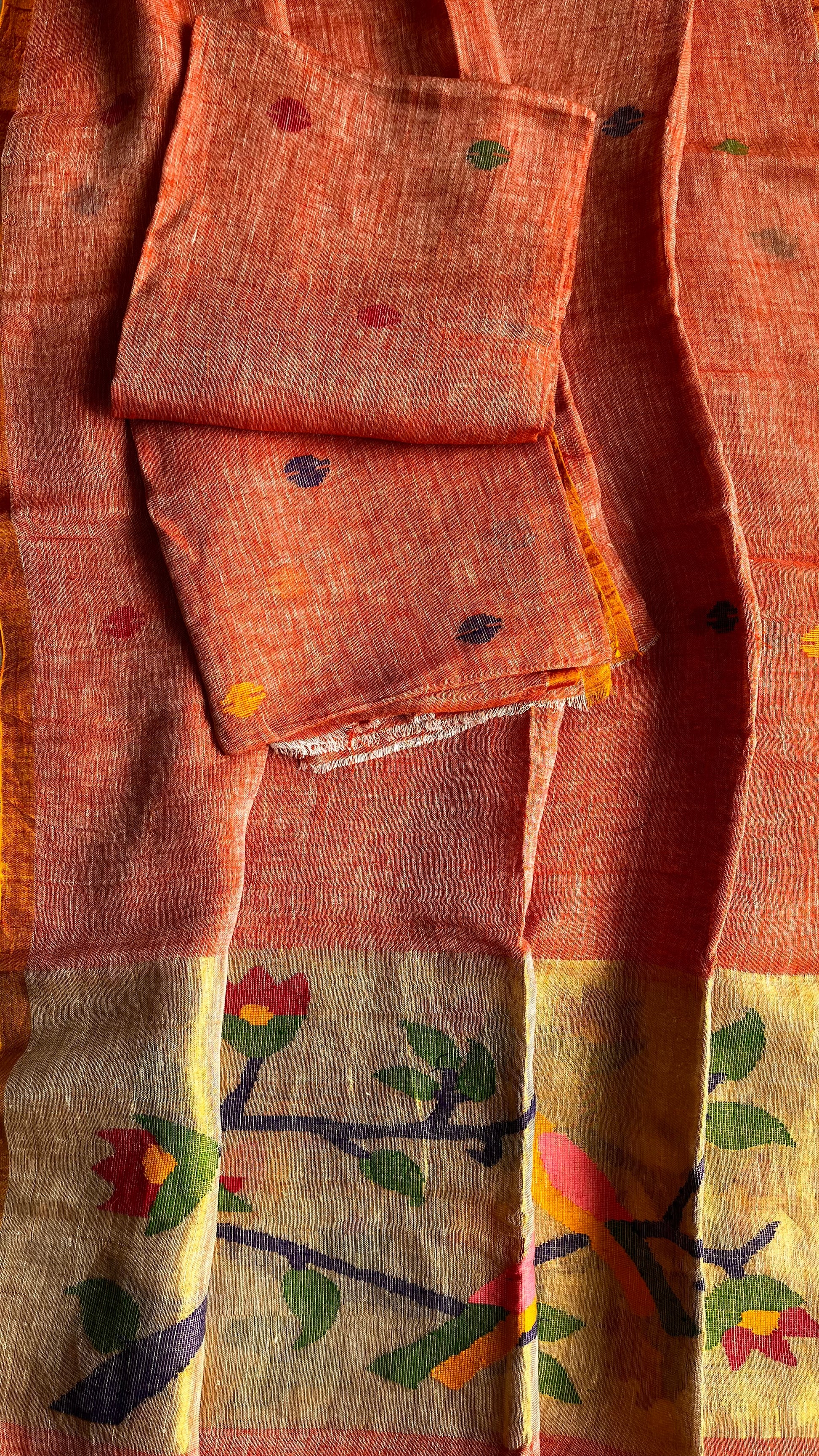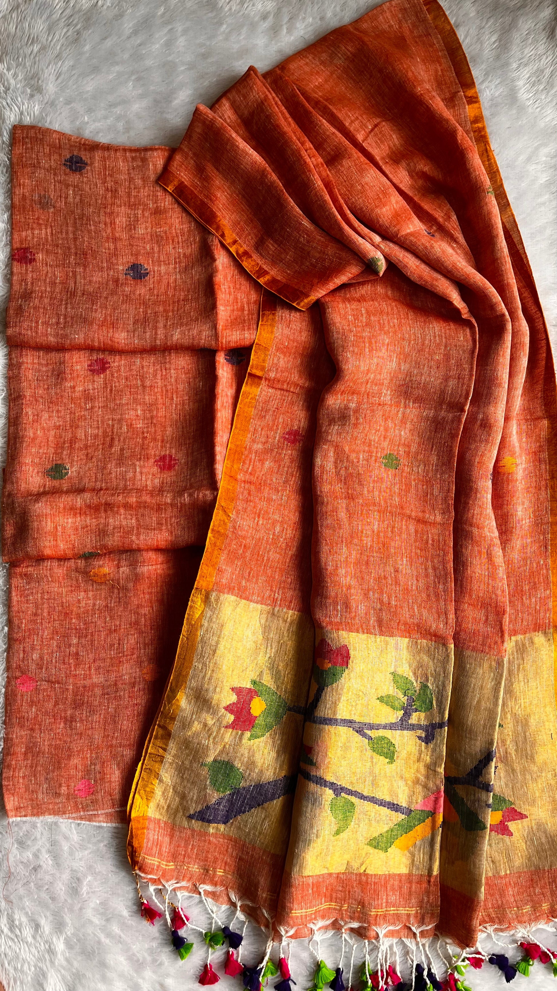 Peach me Please Paithani Unstitched Pure Linen on Linen Hand Woven Daman 2 pc Suit Set