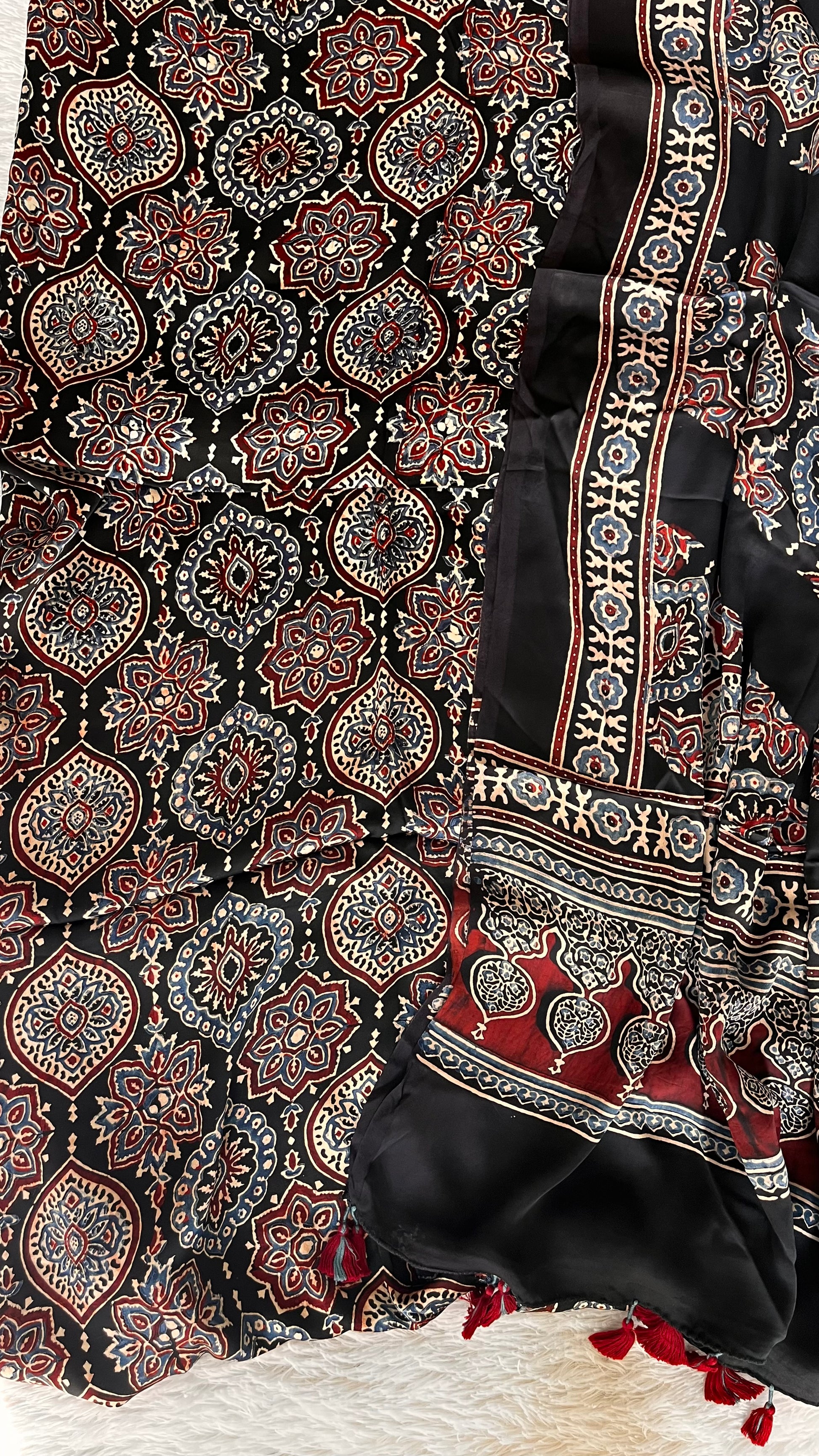 Our fine quality special Ajrakh block printed modal silk dress material set is made using natural dyes through traditional technique of handblock printing by the Khatri community practising Ajrakh Handblock technique in Kutch region of Gujarat for generations. Modal silk is a soft, shiny and highly lustrous fabric, achieved through interlacing modal fibers and silk yarns. Ajrakh Modal Silk fabric has opulence of silk and the comfort of cotton making it a very fine and soft textured weave. Thank you for choosing handmade!