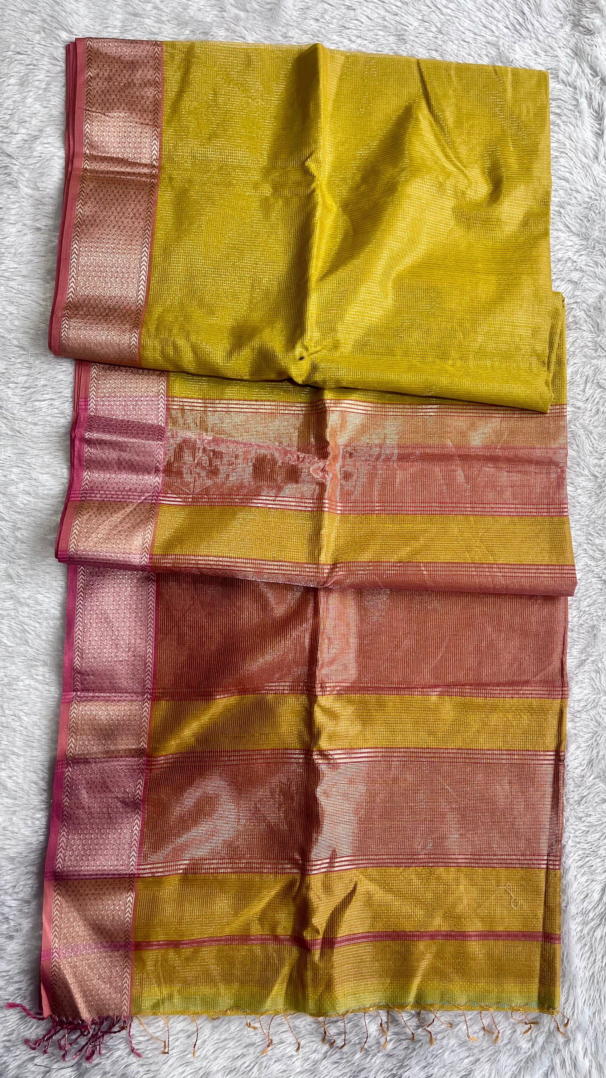 Sunshine Yellow with Pink Zari Border Handwoven Maheshwari Tissue Silk Saree