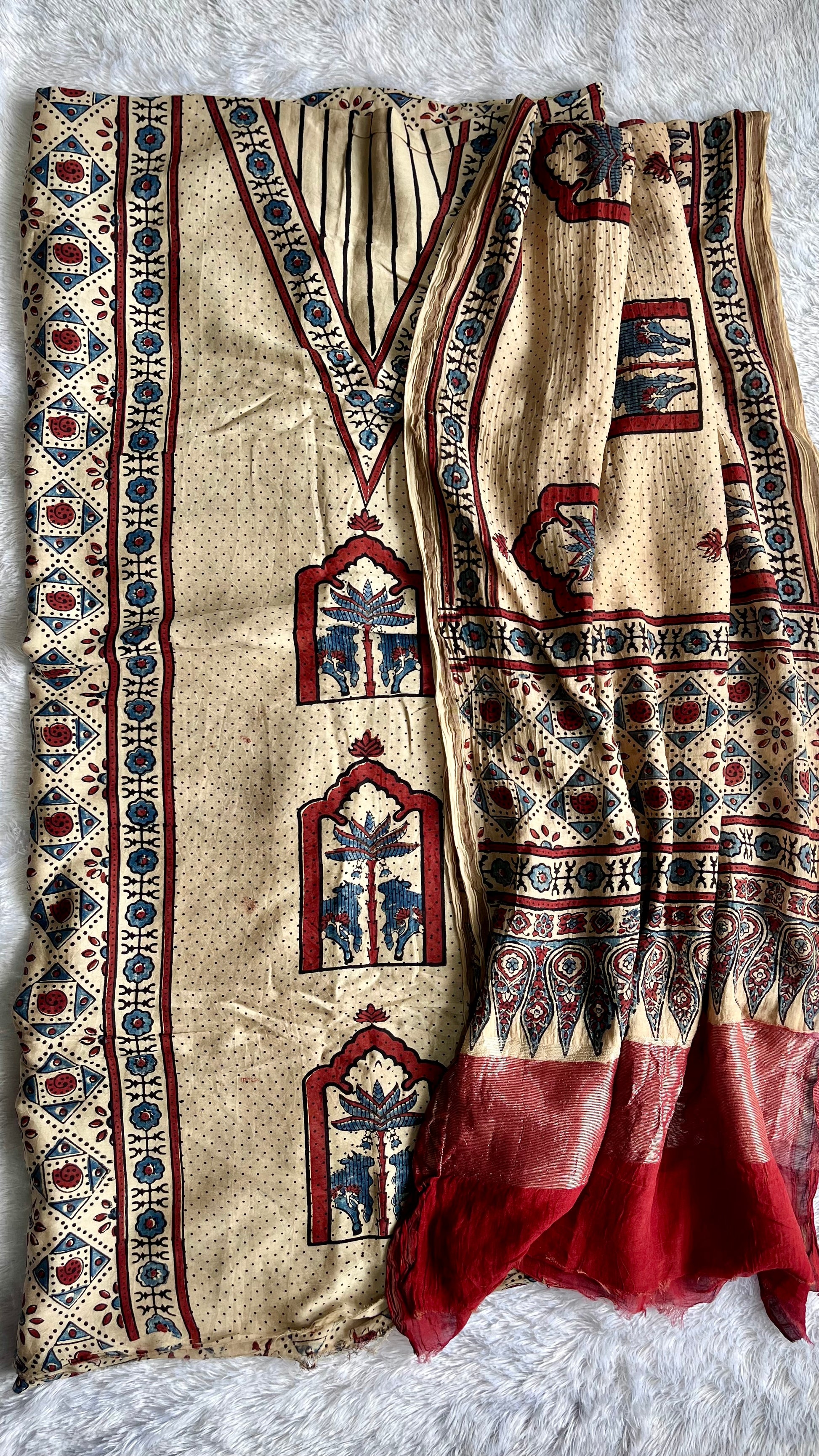 Milky White and Red Jharokha Motif Chanderi Silk Suit set with Ajrakh Hand Block Printing