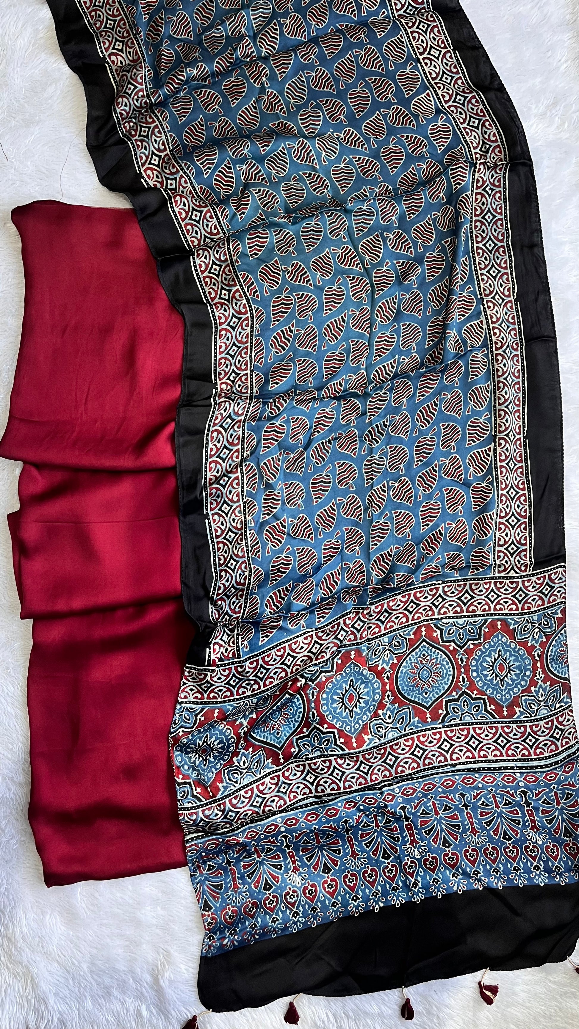 Our fine quality special Ajrakh block printed modal silk dress material set is made using natural dyes through traditional technique of handblock printing by the Khatri community practising Ajrakh Handblock technique in Kutch region of Gujarat for generations. Modal silk is a soft, shiny and highly lustrous fabric, achieved through interlacing modal fibers and silk yarns. Ajrakh Modal Silk fabric has opulence of silk and the comfort of cotton making it a very fine and soft textured weave. Thank you for choosing handmade!
