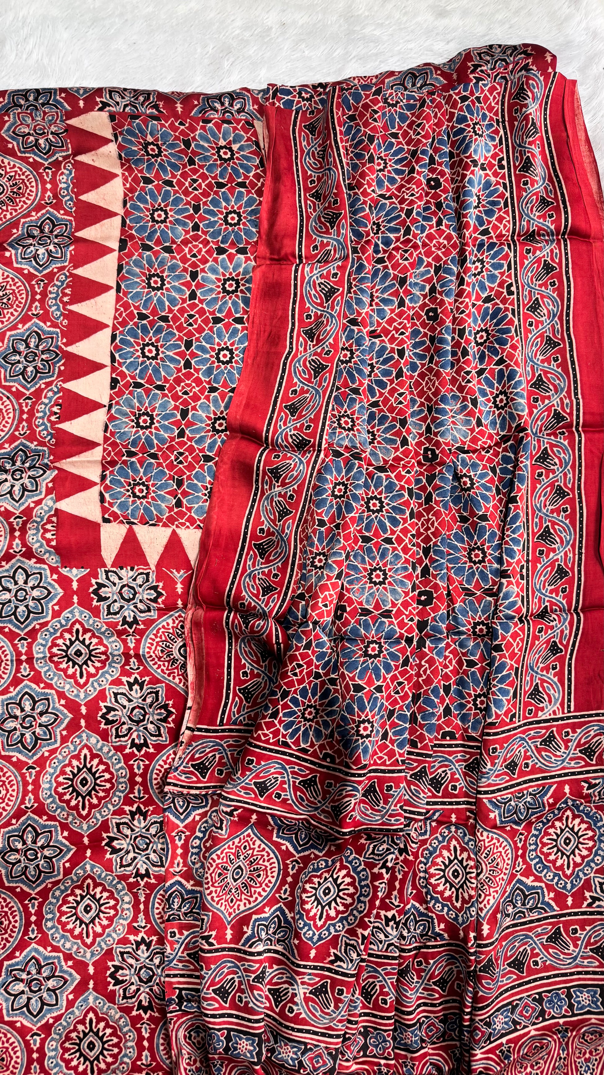 Our fine quality special Ajrakh block printed modal silk dress material set is made using natural dyes through traditional technique of handblock printing by the Khatri community practising Ajrakh Handblock technique in Kutch region of Gujarat for generations. Modal silk is a soft, shiny and highly lustrous fabric, achieved through interlacing modal fibers and silk yarns. Ajrakh Modal Silk fabric has opulence of silk and the comfort of cotton making it a very fine and soft textured weave. Thank you for choosing handmade!