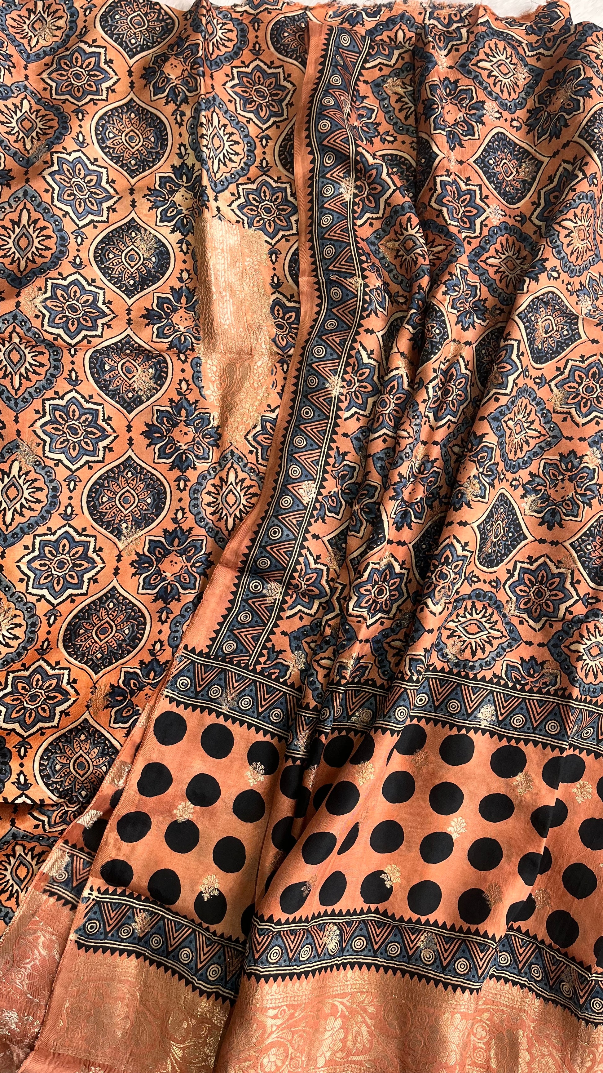 Saffron Shafe Badaam Boota Pure Dola Silk Ajrakh Hand Block Print 2pc Suit Material Set with Menakari Yoke and Nakkashi Dupatta