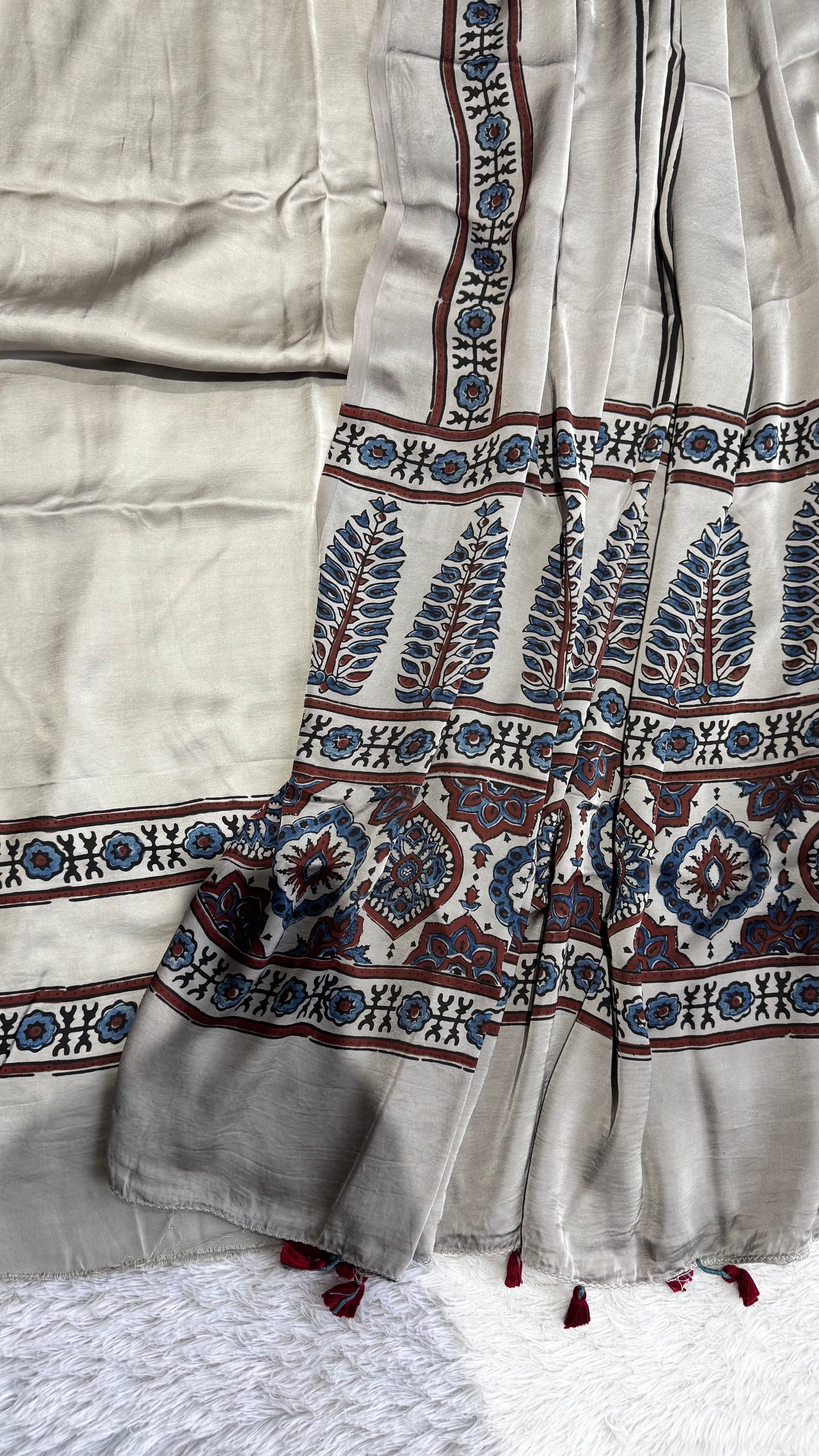 Our fine quality special Ajrakh block printed modal silk dress material set is made using natural dyes through traditional technique of handblock printing by the Khatri community practising Ajrakh Handblock technique in Kutch region of Gujarat for generations. Modal silk is a soft, shiny and highly lustrous fabric, achieved through interlacing modal fibers and silk yarns. Ajrakh Modal Silk fabric has opulence of silk and the comfort of cotton making it a very fine and soft textured weave. Thank you for choosing handmade!