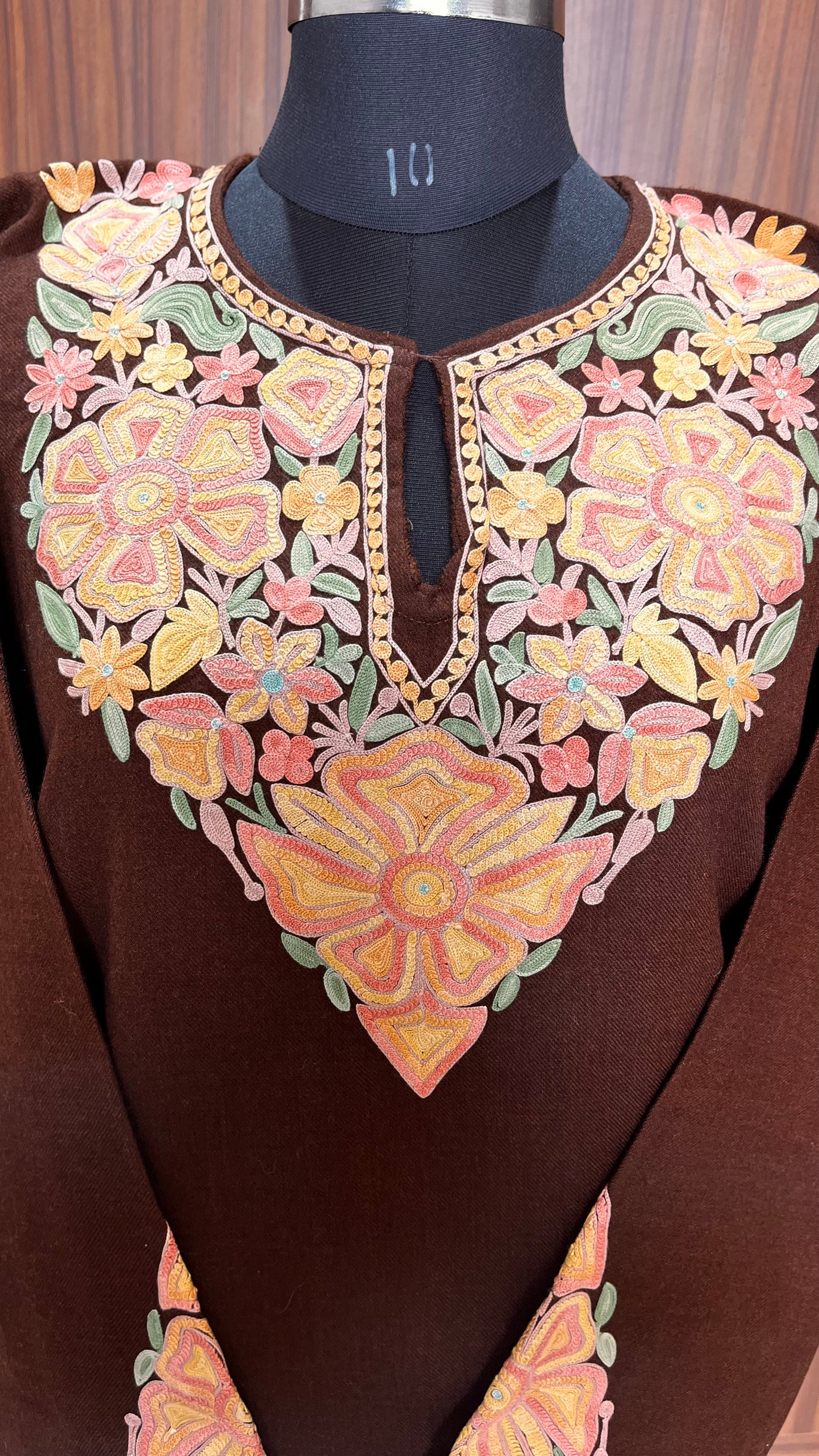 Dark Brown Aari Hand Embroidered Pure Marino Wool Pheran with Pockets