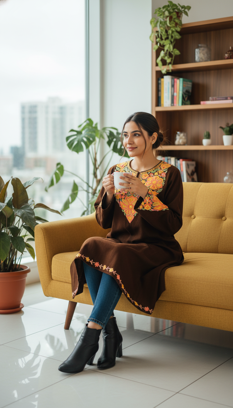 This traditional Pheran is inspired by the Kashmiri culture. It is made from the best quality of wool, with intricate aari embroidery. The unique design of this Pheran is alluring and eye catching, making it perfect for those looking for a traditional outfit that stands out from the crowd.