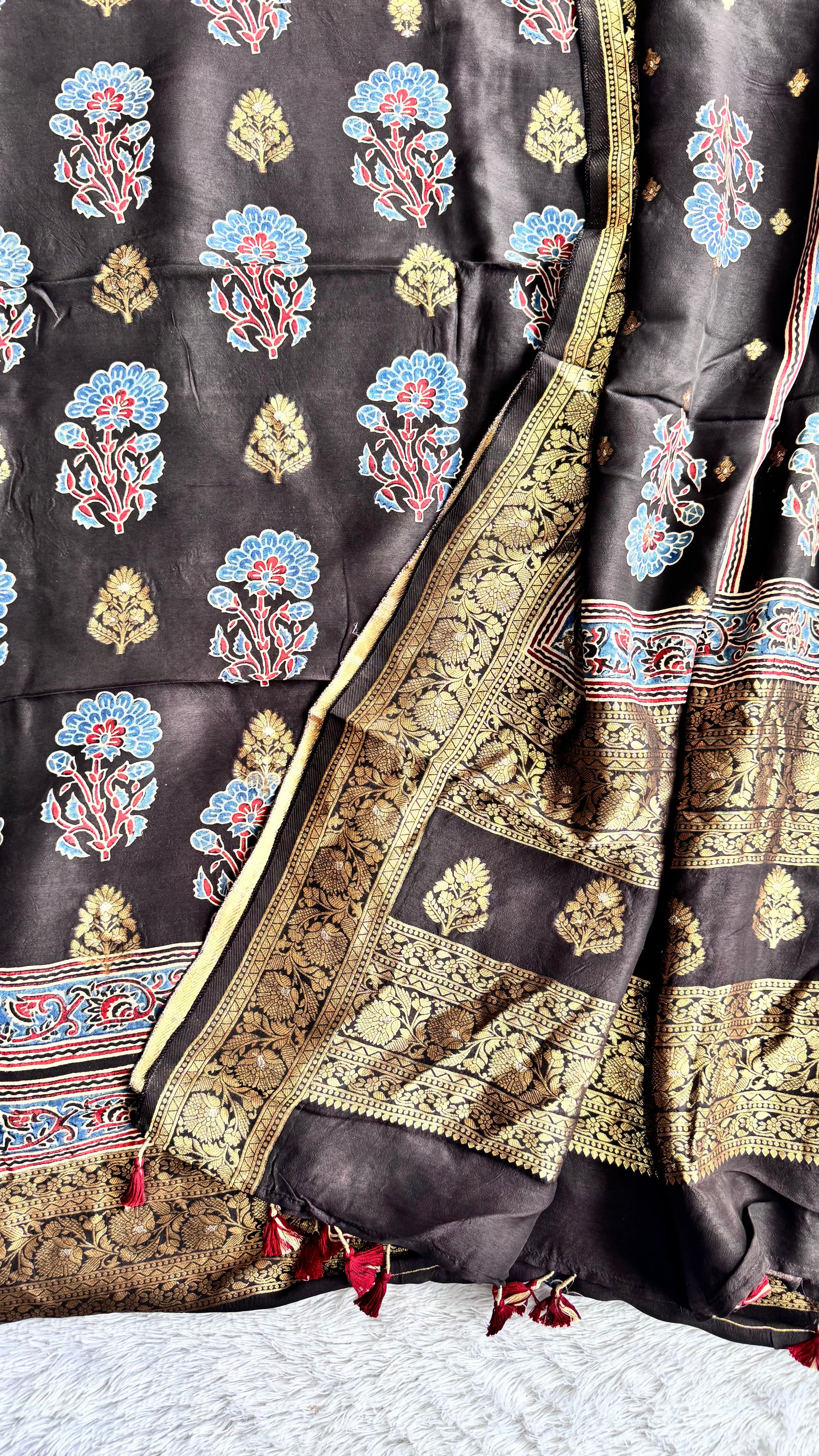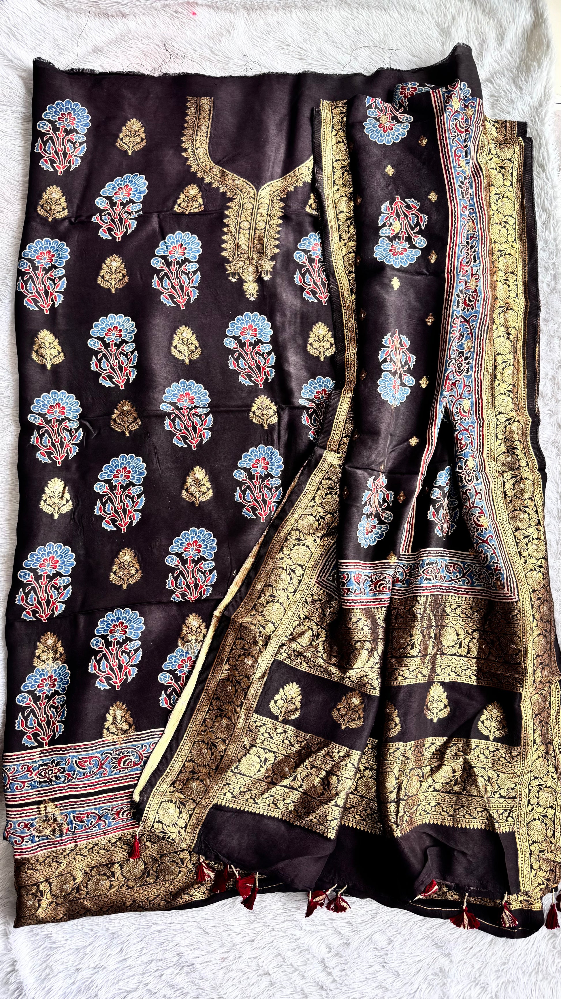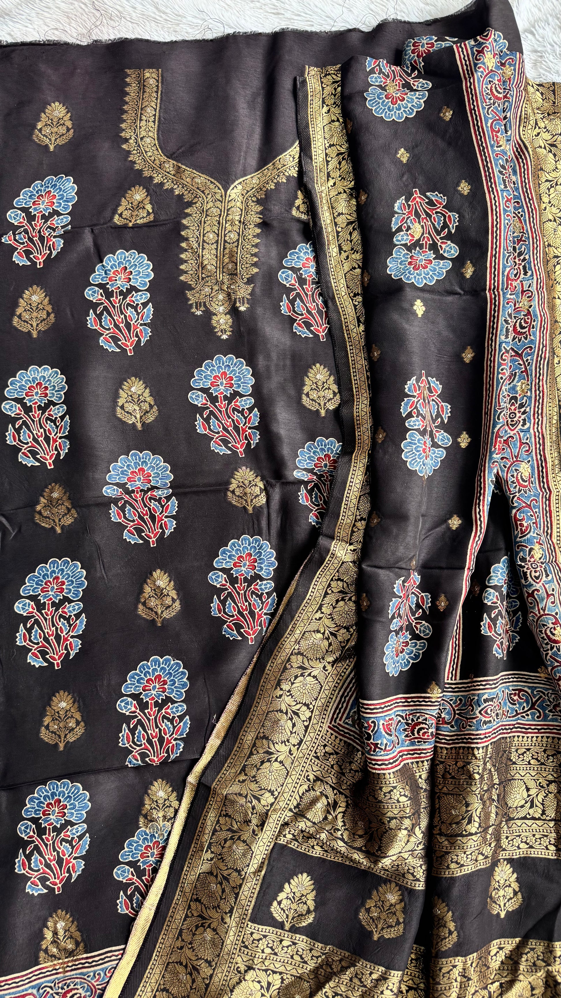 Black Mugal Buta Motif Pure Dola Silk Ajrakh Hand Block Print 2pc Suit Material Set with Zari Yoke and Nakkashi Dupatta