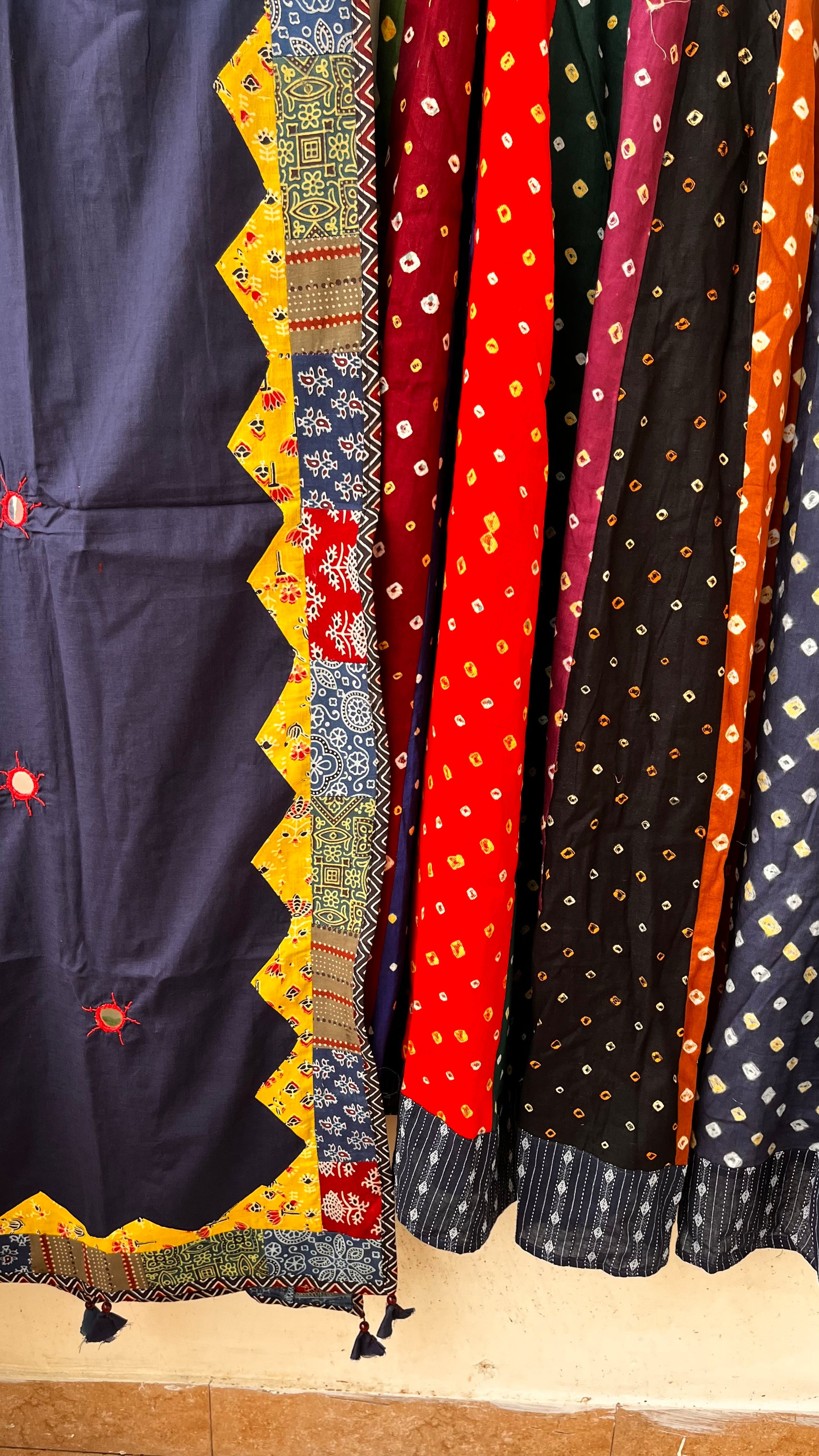 Twirl in style 💃 with our gheredaaar kali cotton skirts paired with hand applique Ajrakh dupattas ✨💙 finished with mirror work & playful tassels.