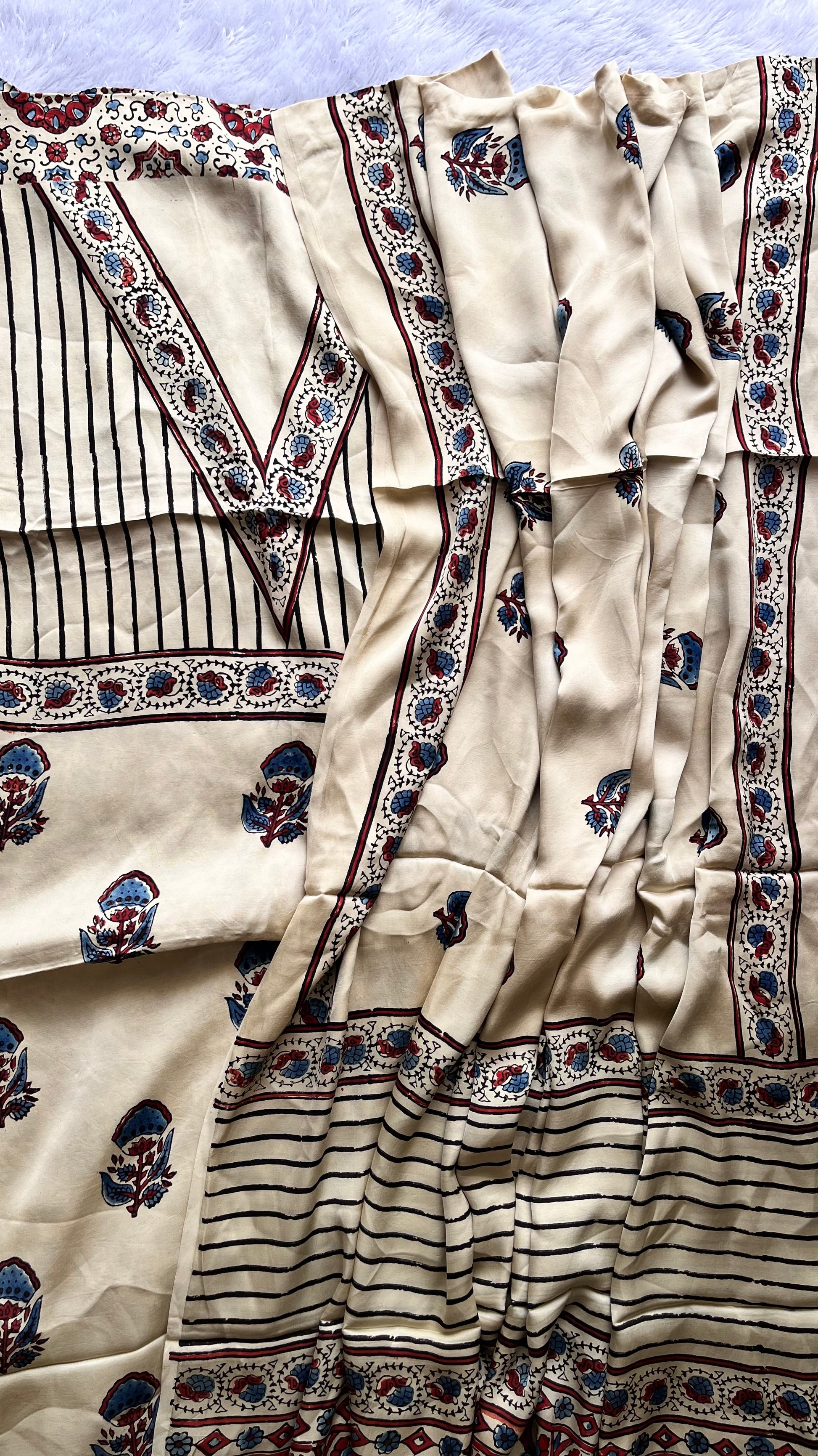 Our fine quality special Ajrakh block printed modal silk dress material set is made using natural dyes through traditional technique of handblock printing by the Khatri community practising Ajrakh Handblock technique in Kutch region of Gujarat for generations. Modal silk is a soft, shiny and highly lustrous fabric, achieved through interlacing modal fibers and silk yarns. Ajrakh Modal Silk fabric has opulence of silk and the comfort of cotton making it a very fine and soft textured weave. Thank you for choosing handmade!