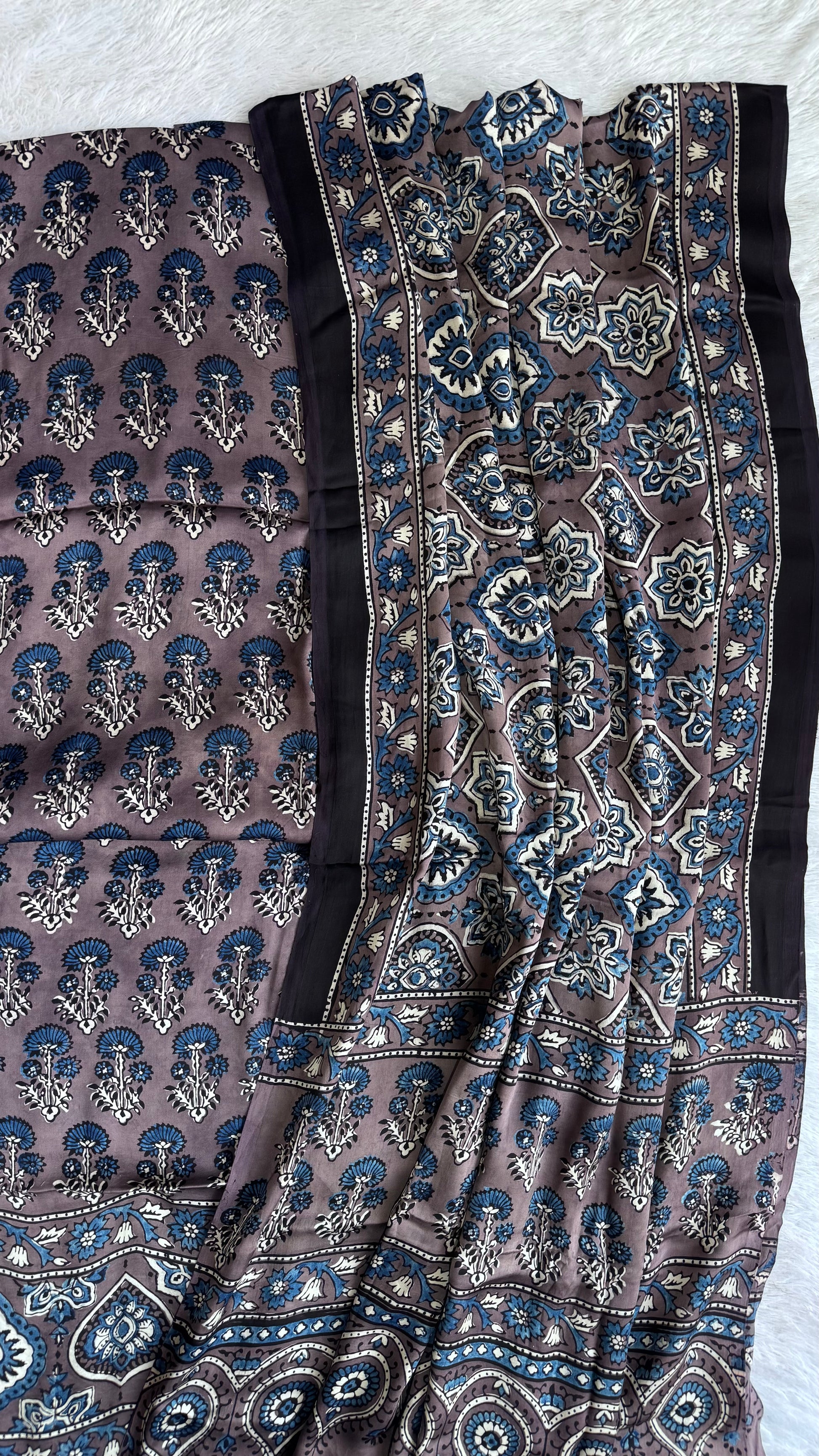 Our fine quality special Ajrakh block printed modal silk dress material set is made using natural dyes through traditional technique of handblock printing by the Khatri community practising Ajrakh Handblock technique in Kutch region of Gujarat for generations. Modal silk is a soft, shiny and highly lustrous fabric, achieved through interlacing modal fibers and silk yarns. Ajrakh Modal Silk fabric has opulence of silk and the comfort of cotton making it a very fine and soft textured weave. Thank you for choosing handmade!