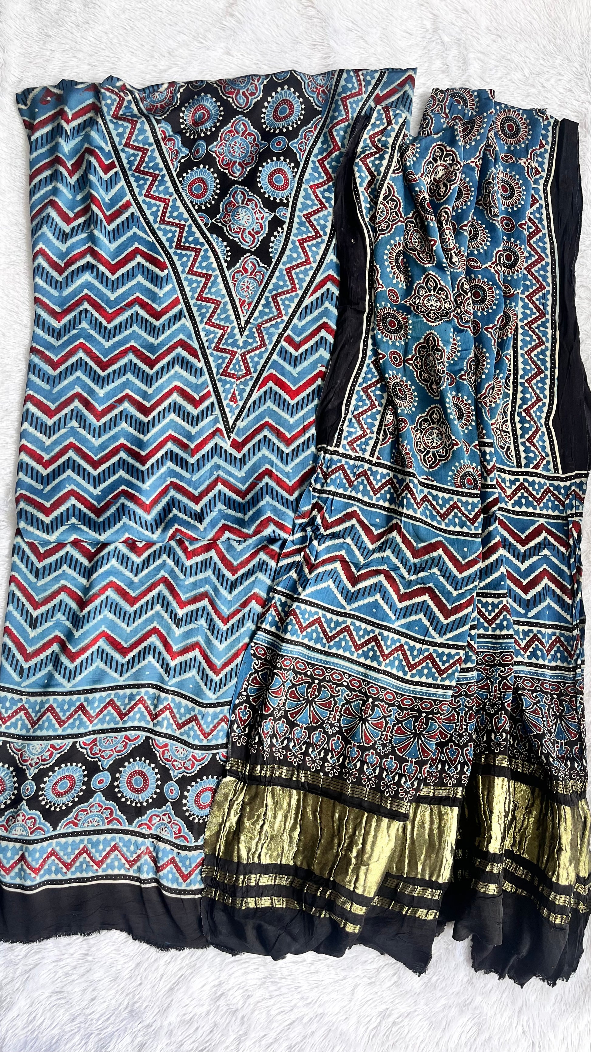 Blue and Black Zigzag Motif Ajrakh Hand Block Modal Silk 2pc Suit Material Set with Lagdi Patti Dupatta