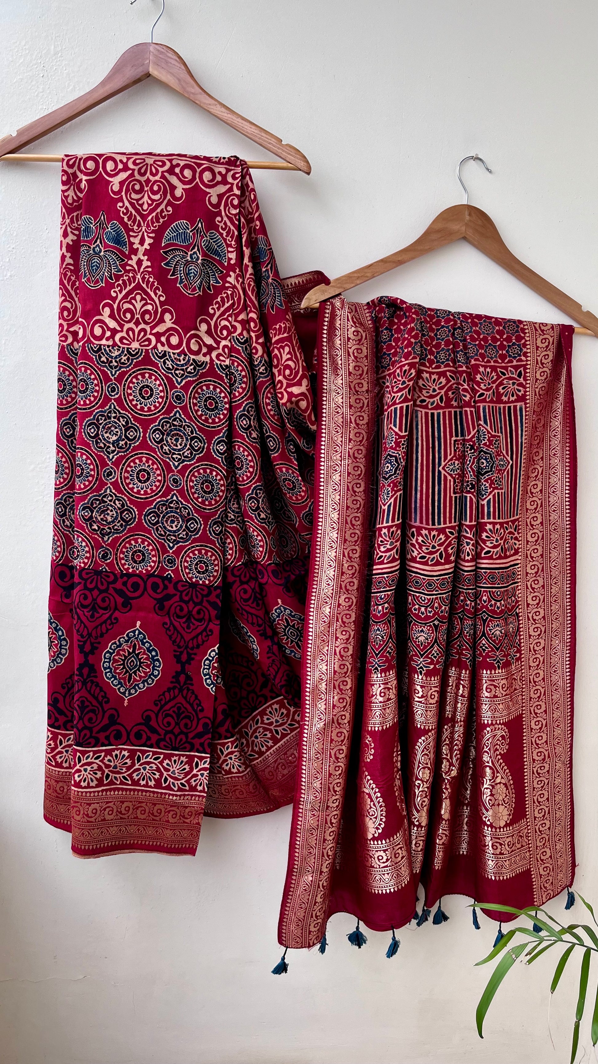 Maroon and Red Abstarct Buta Motif Ajrakh Hand Block Dola Silk Saree with Zari Pallu (With Blouse)