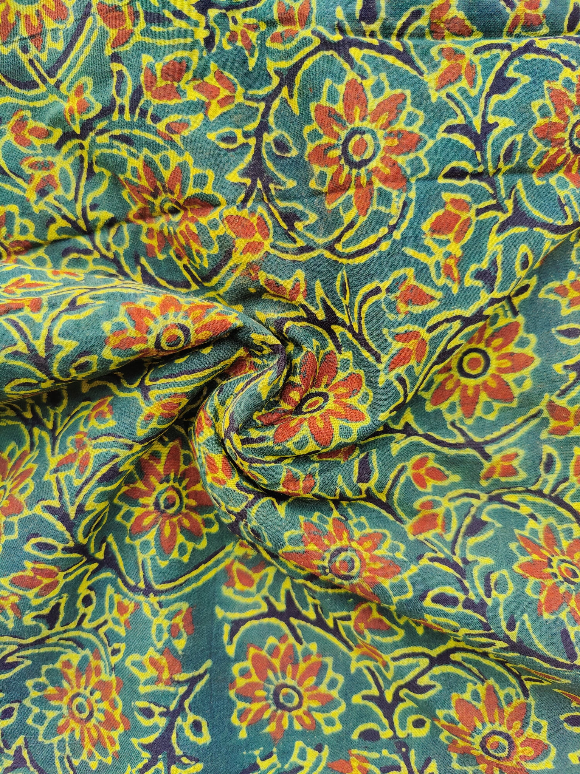 Green Flower Motif Ajrakh Hand Block Printed Natural Dyed Cotton Fabric