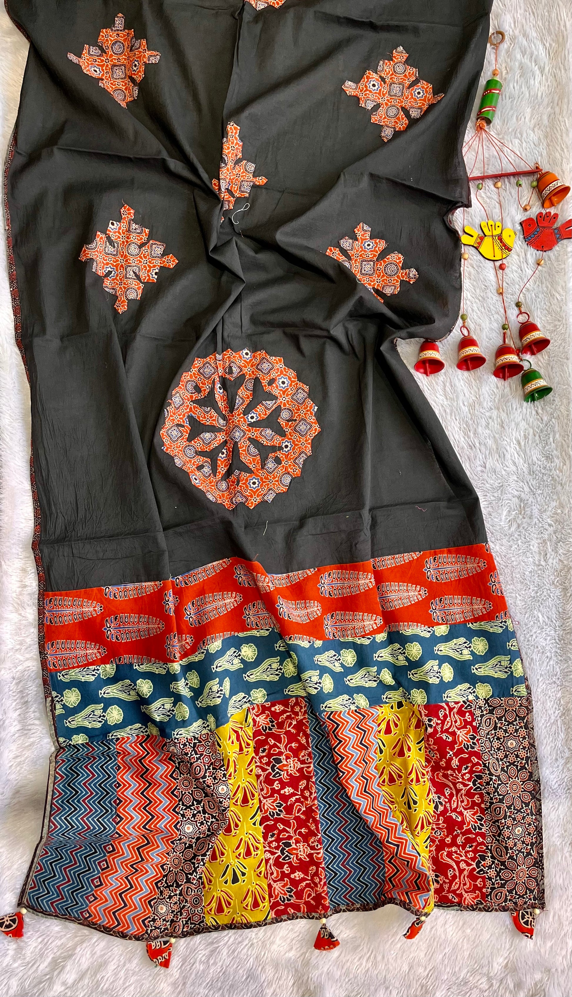 Black Ajrakh Applique Patchwork Cotton Dupatta