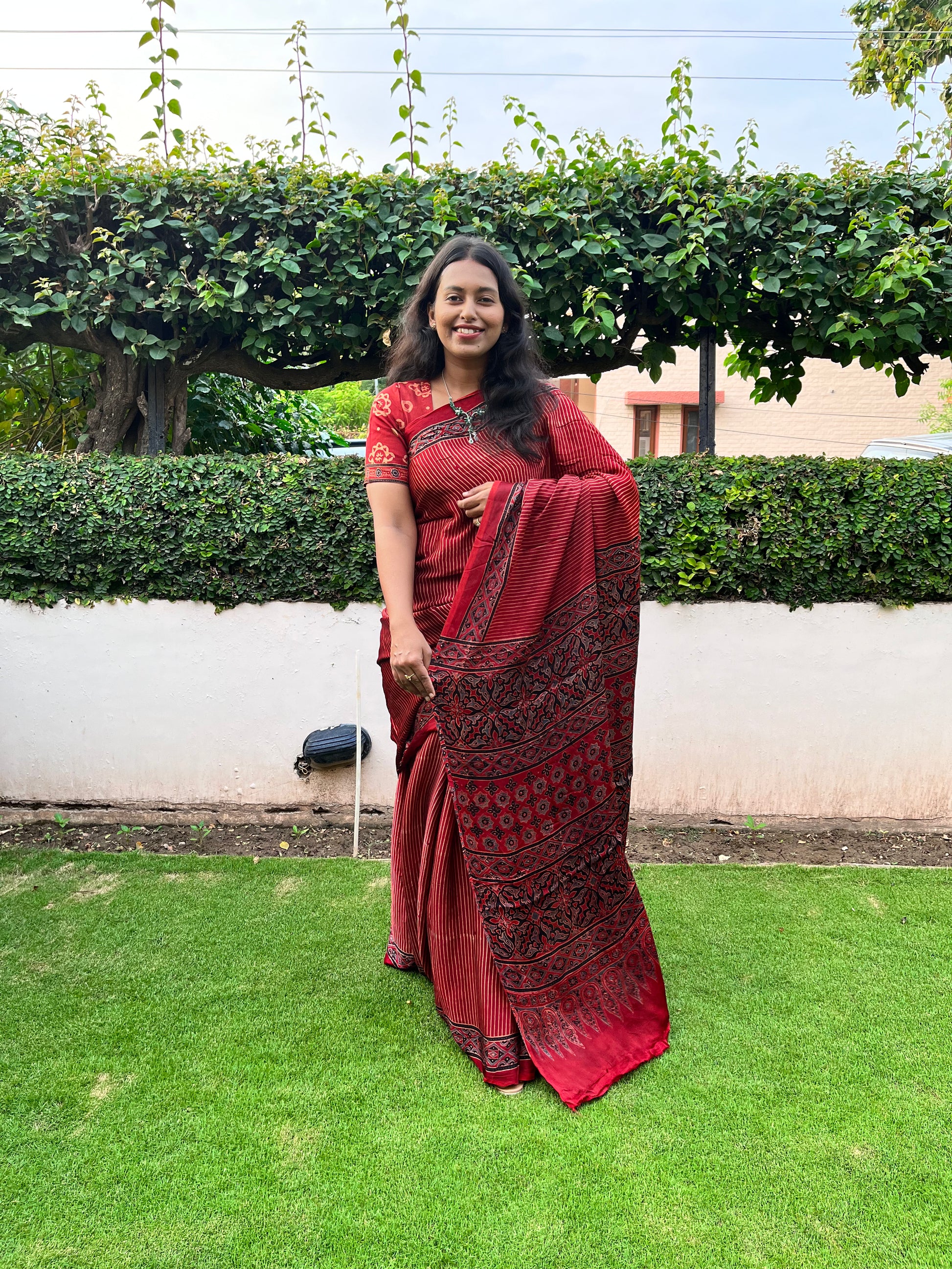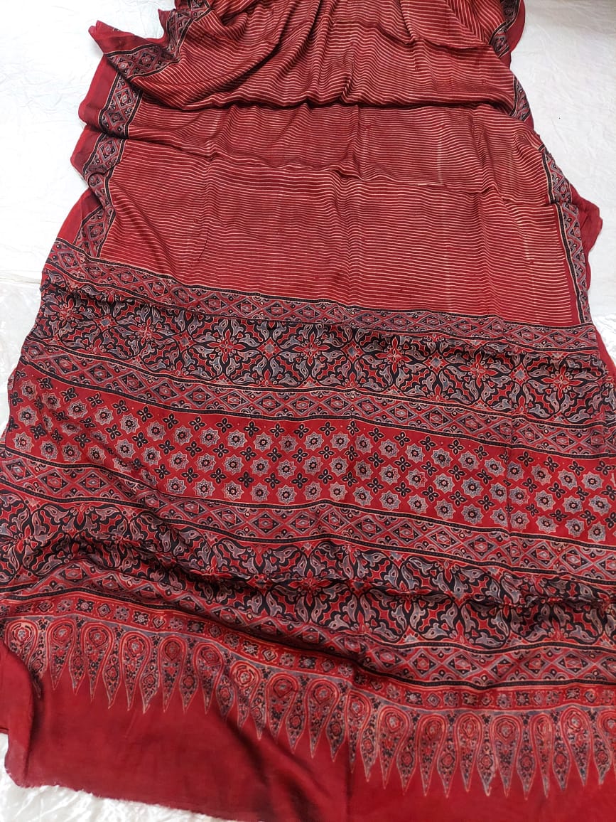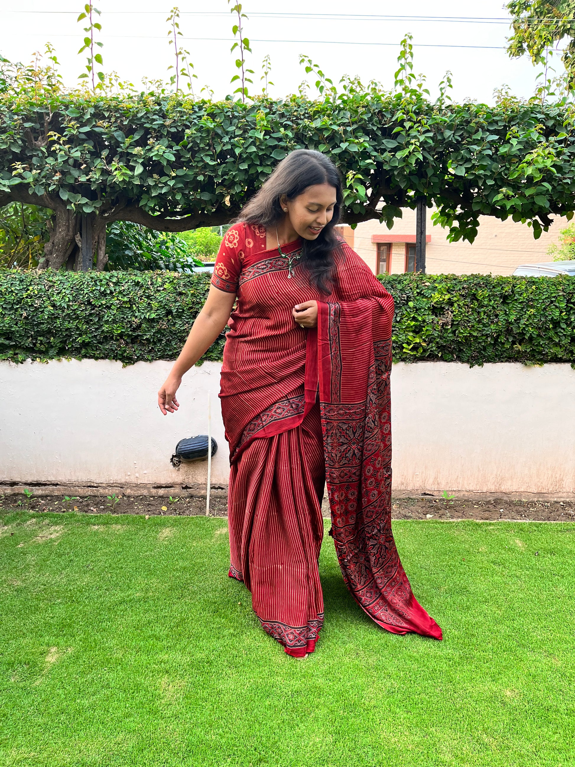 Lal Dhaari Ajrakh Hand Block Natural Dye Modal Silk Saree With Blouse