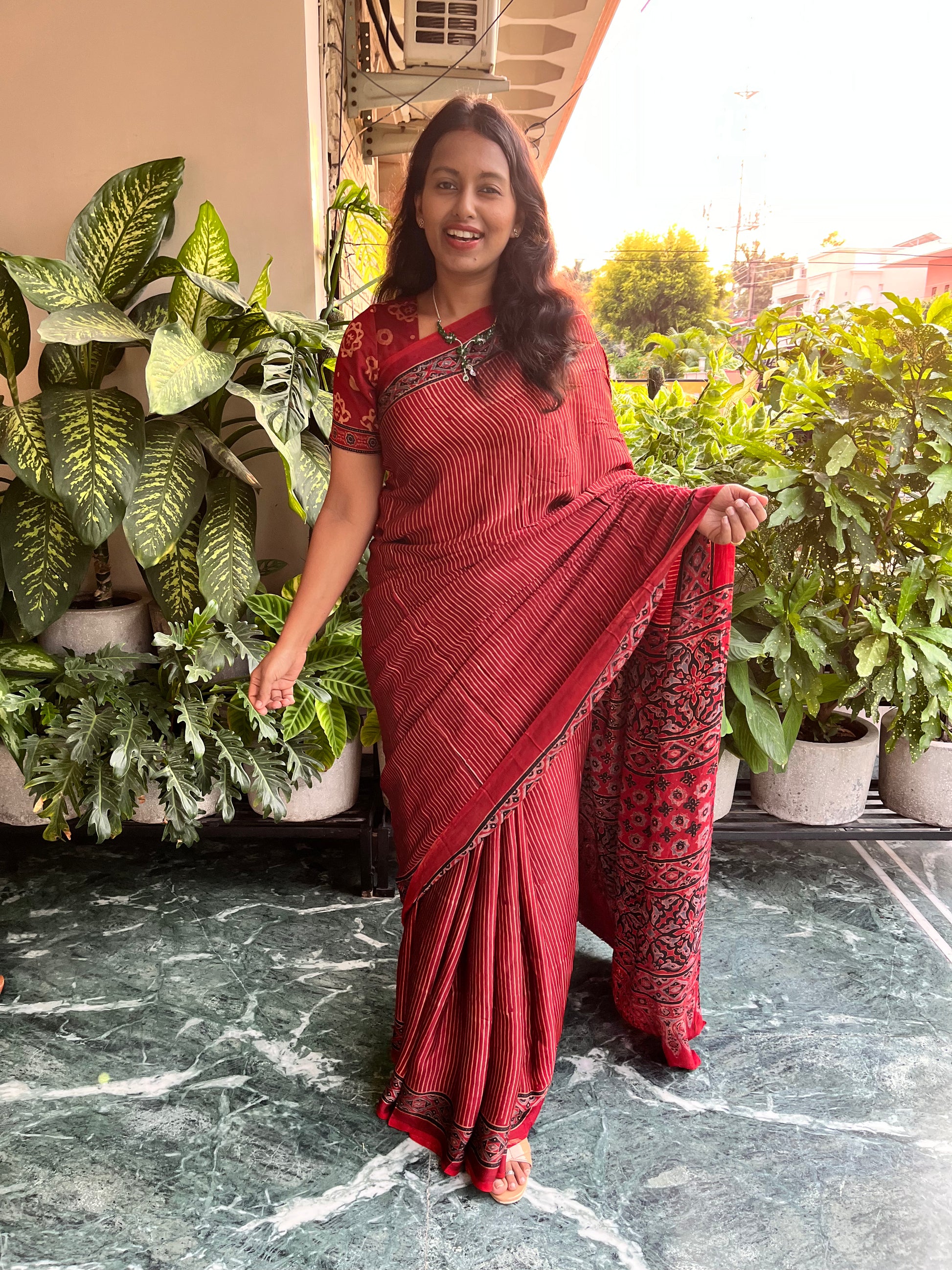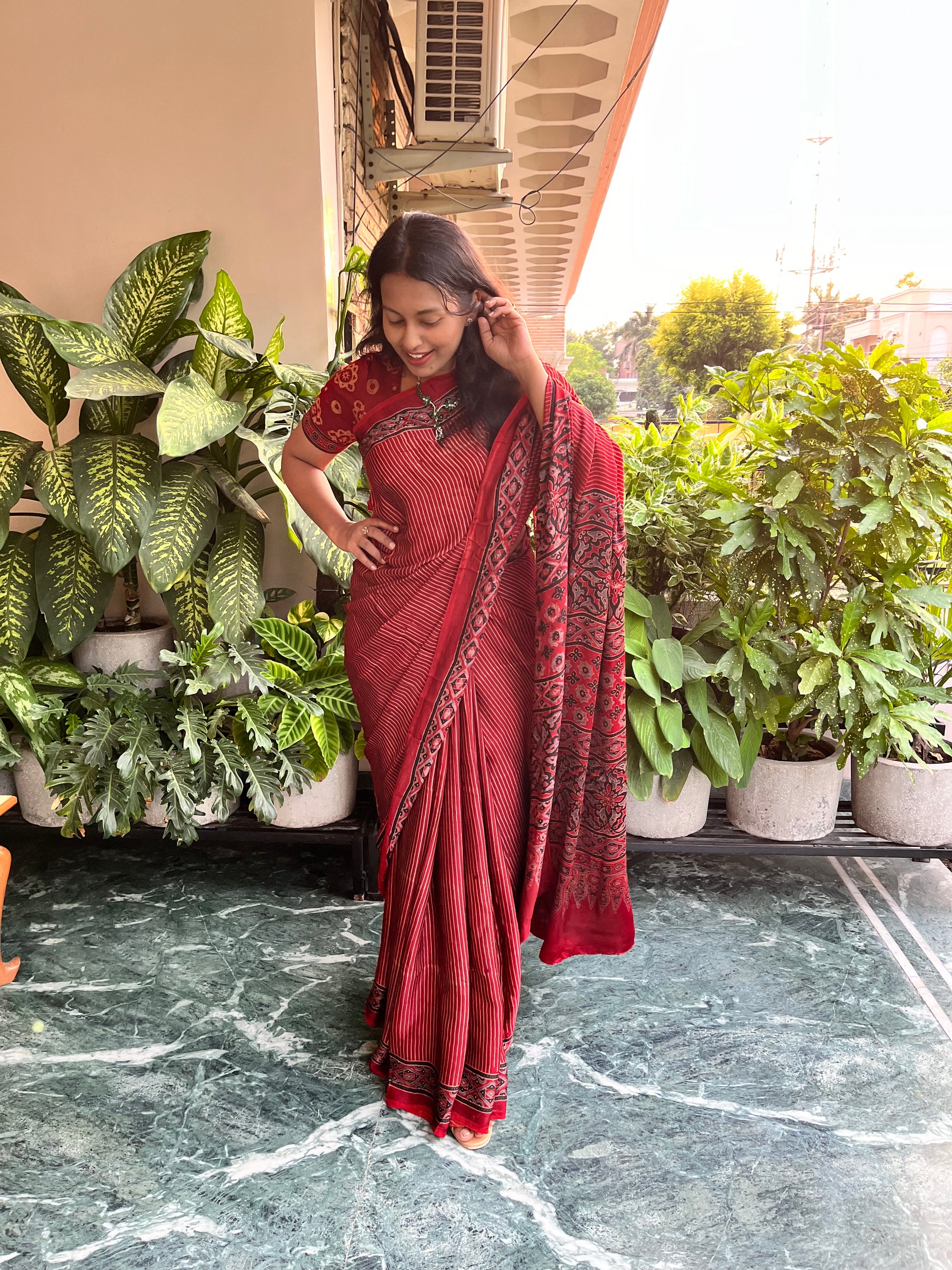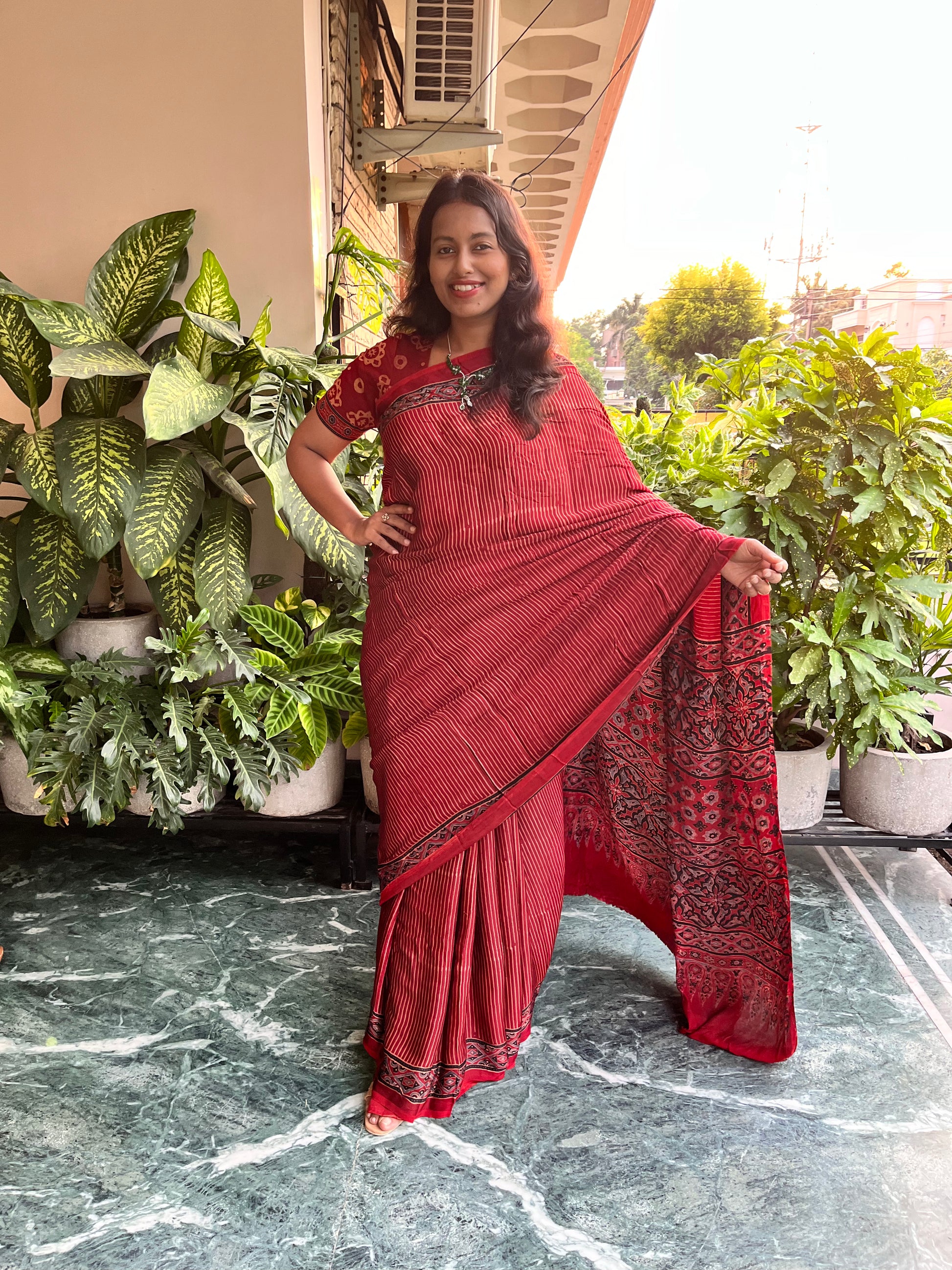 Lal Dhaari Ajrakh Hand Block Natural Dye Modal Silk Saree With Blouse