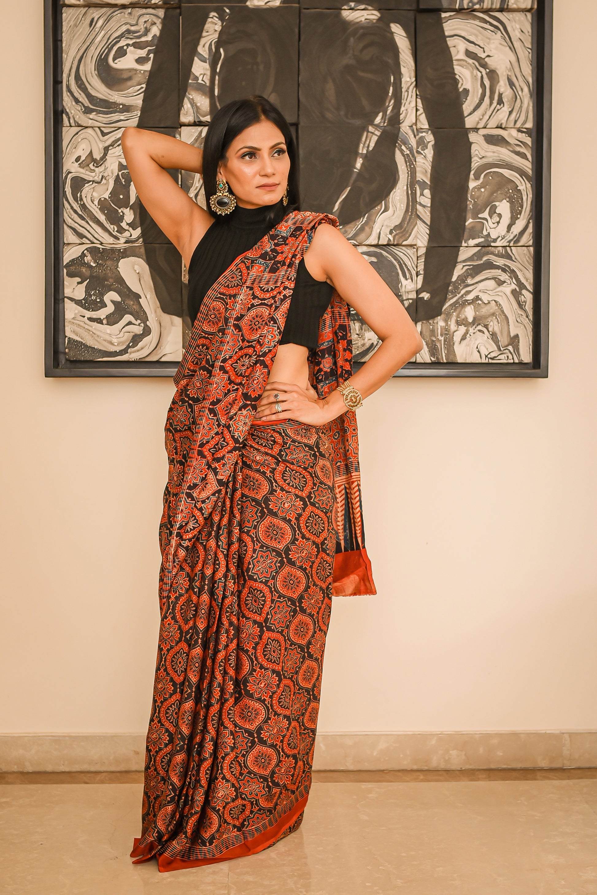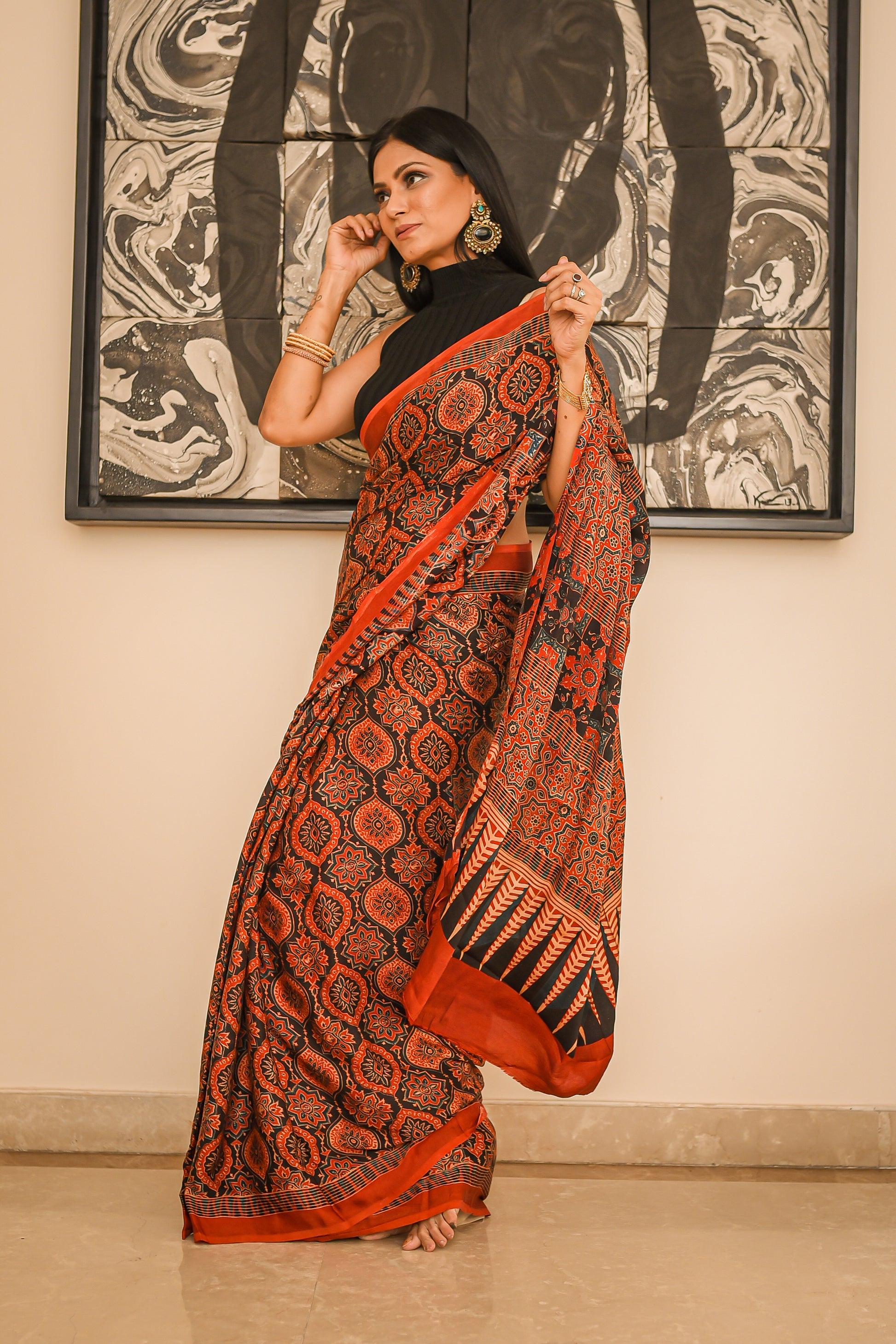 Love is Red Ajrakh Hand Block Natural Dye Modal Silk Saree With Blouse