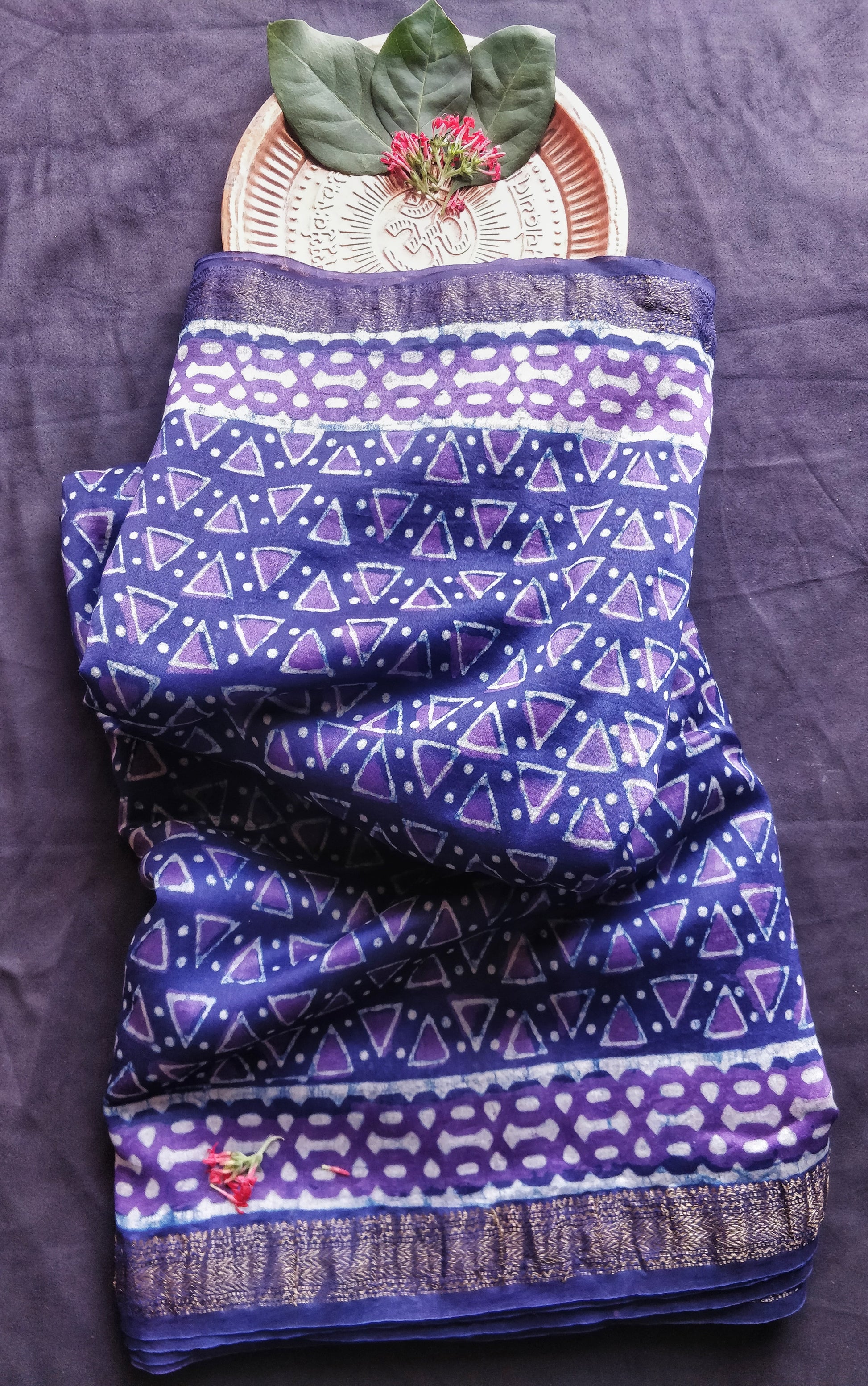 Purple Akola Handblock Printed Dabu Pure Maheshwari Silk Cotton Saree with Zari Border