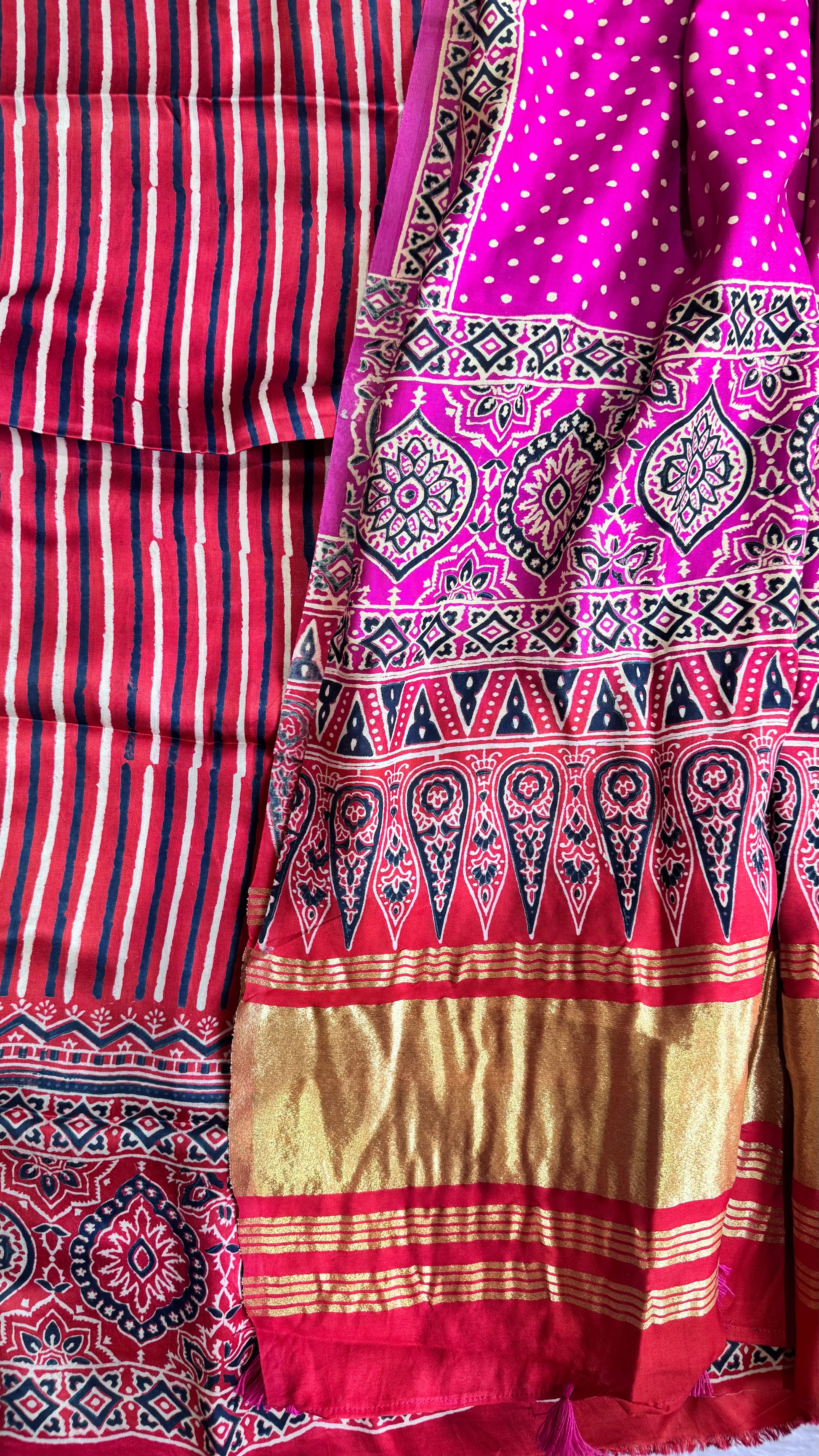 Red Dhaaridar Modal Silk 3 pc Suit Material Set with Modal Silk Lagdi Patti Dupatta