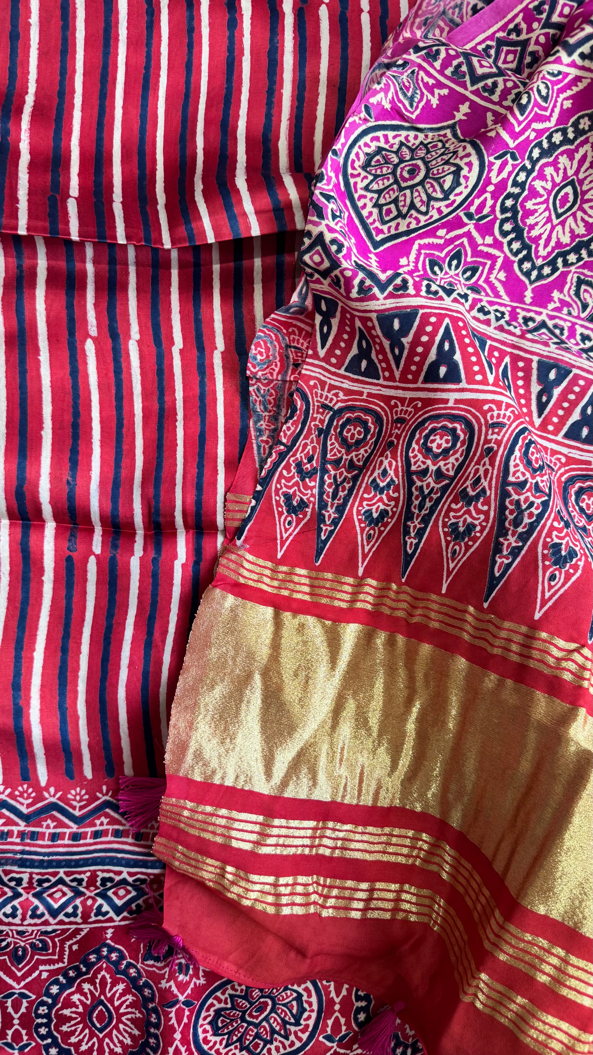 Our fine quality special Ajrakh block printed modal silk dress material set is made using natural dyes through traditional technique of handblock printing by the Khatri community practising Ajrakh Handblock technique in Kutch region of Gujarat for generations. Modal silk is a soft, shiny and highly lustrous fabric, achieved through interlacing modal fibers and silk yarns. Ajrakh Modal Silk fabric has opulence of silk and the comfort of cotton making it a very fine and soft textured weave. Thank you for choosing handmade!