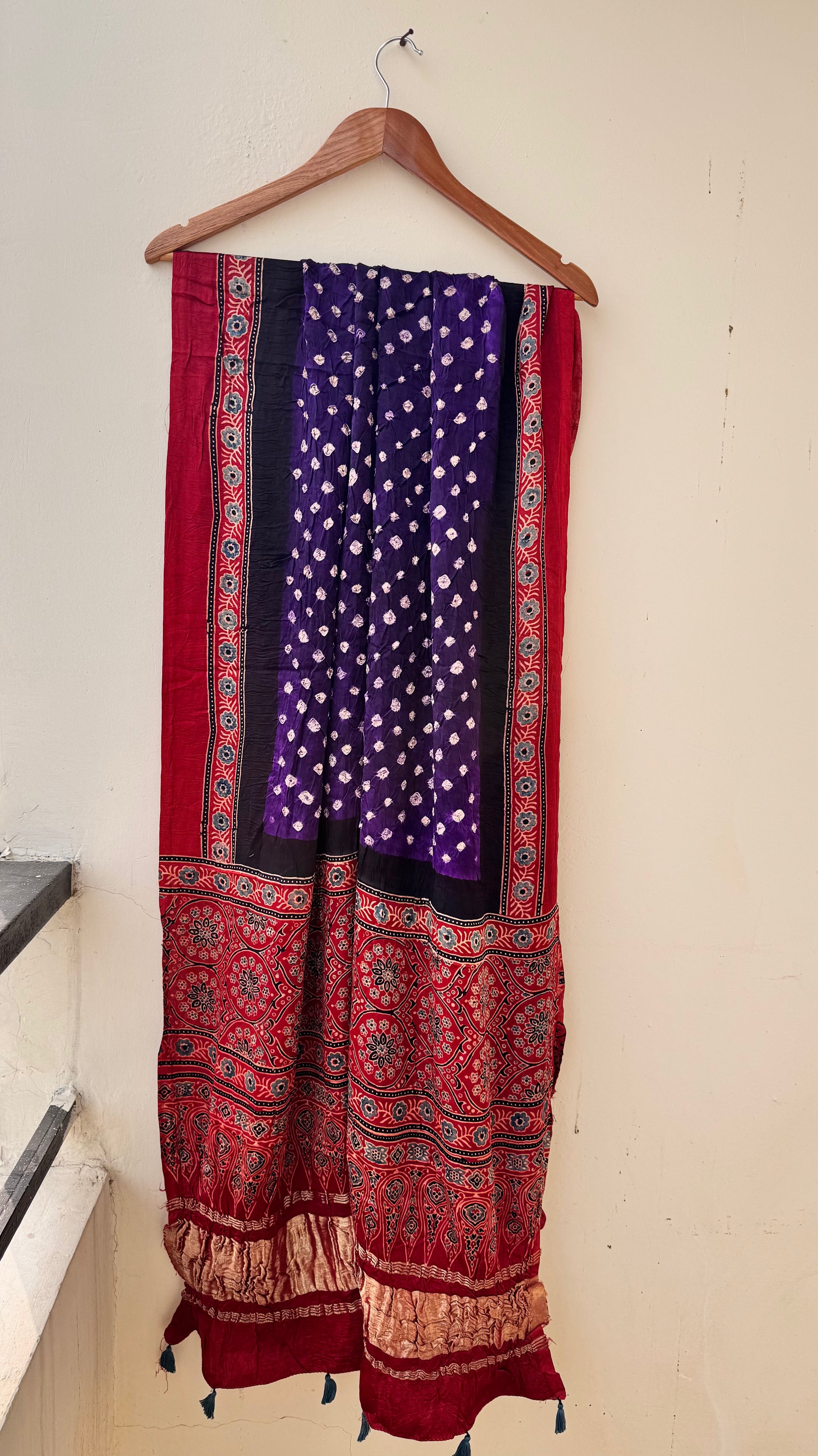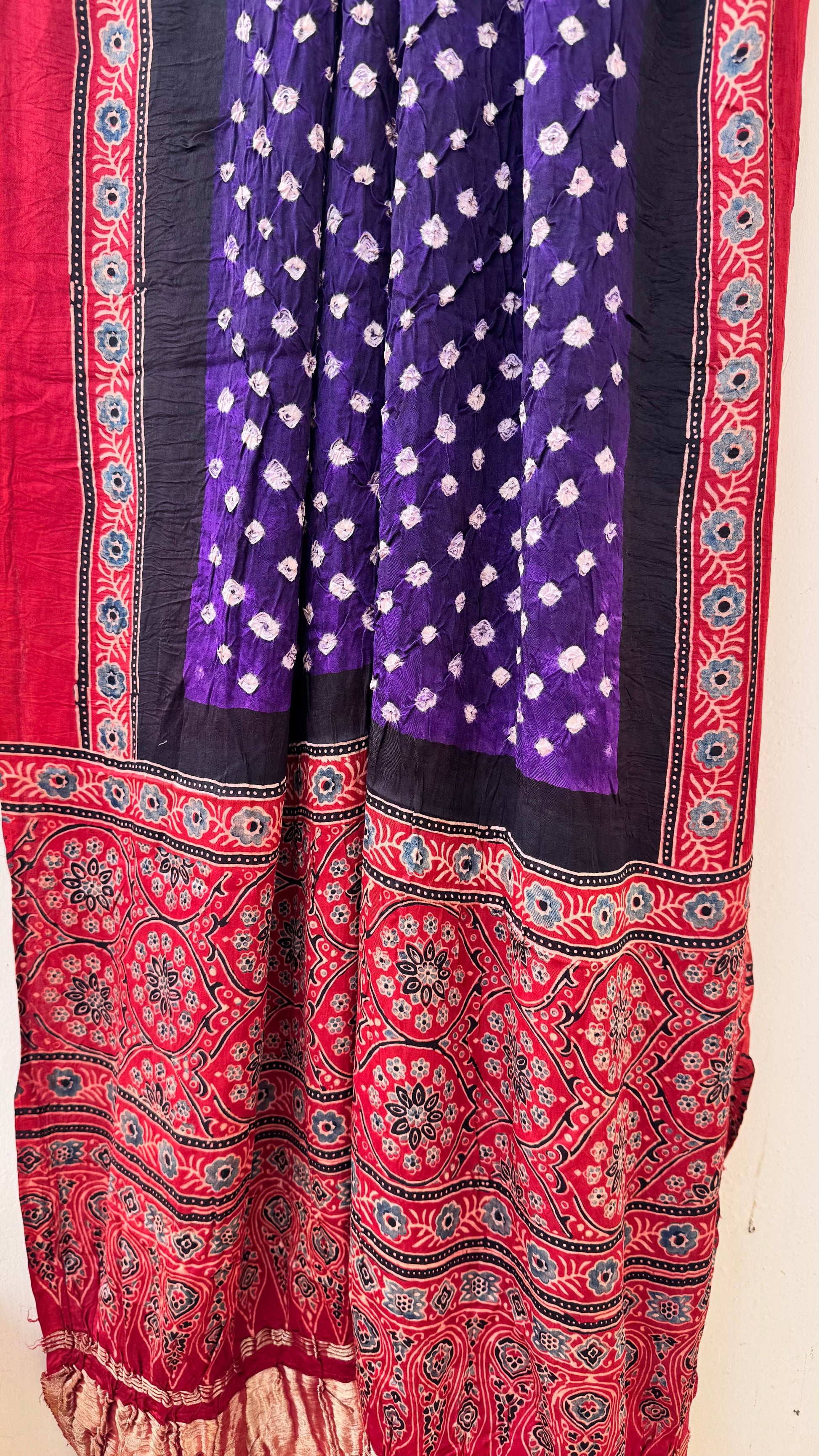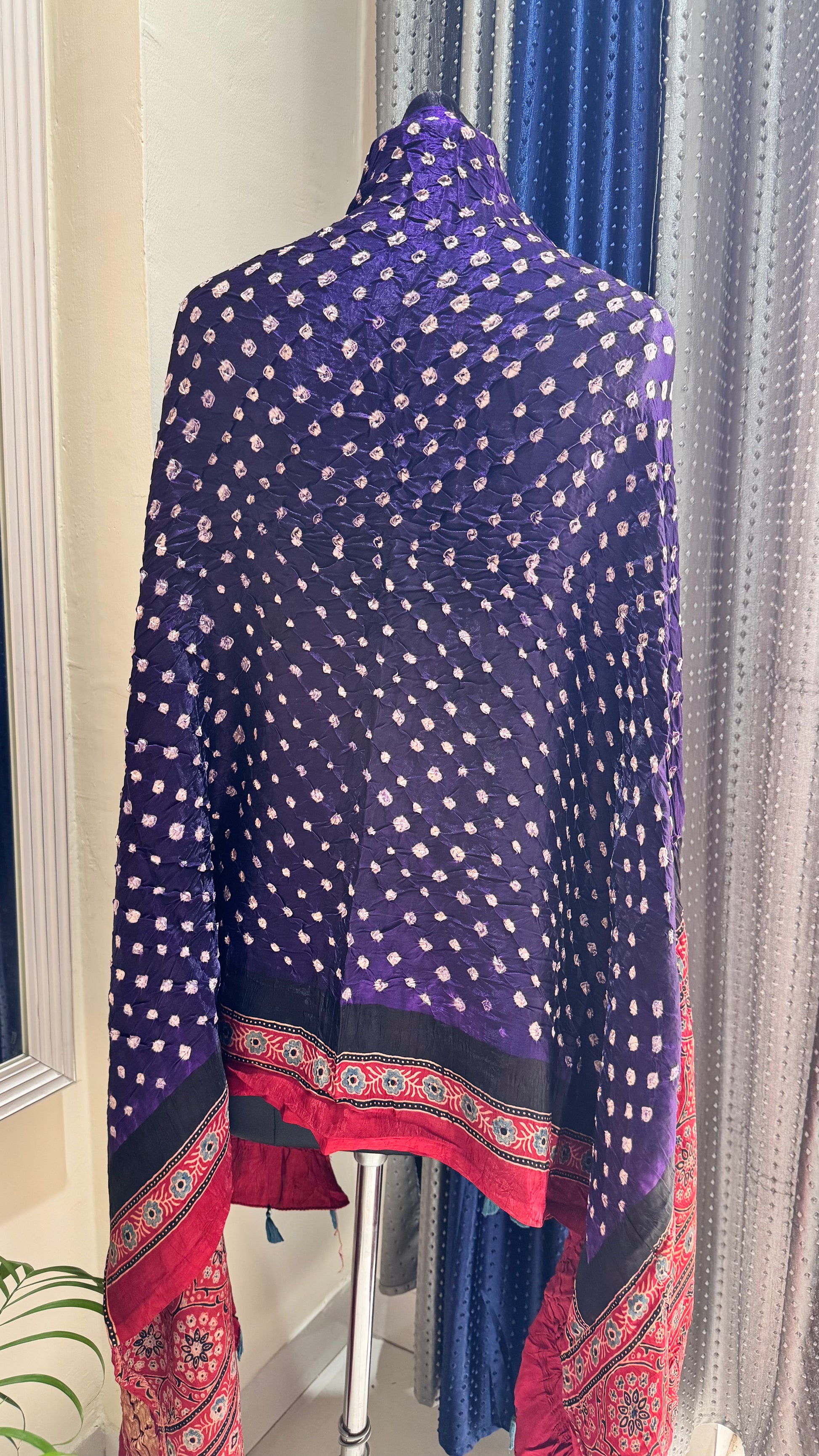 Purple Multi Dotted Modal Silk Bandhani Ajrakh Lagdi Patti Dupatta