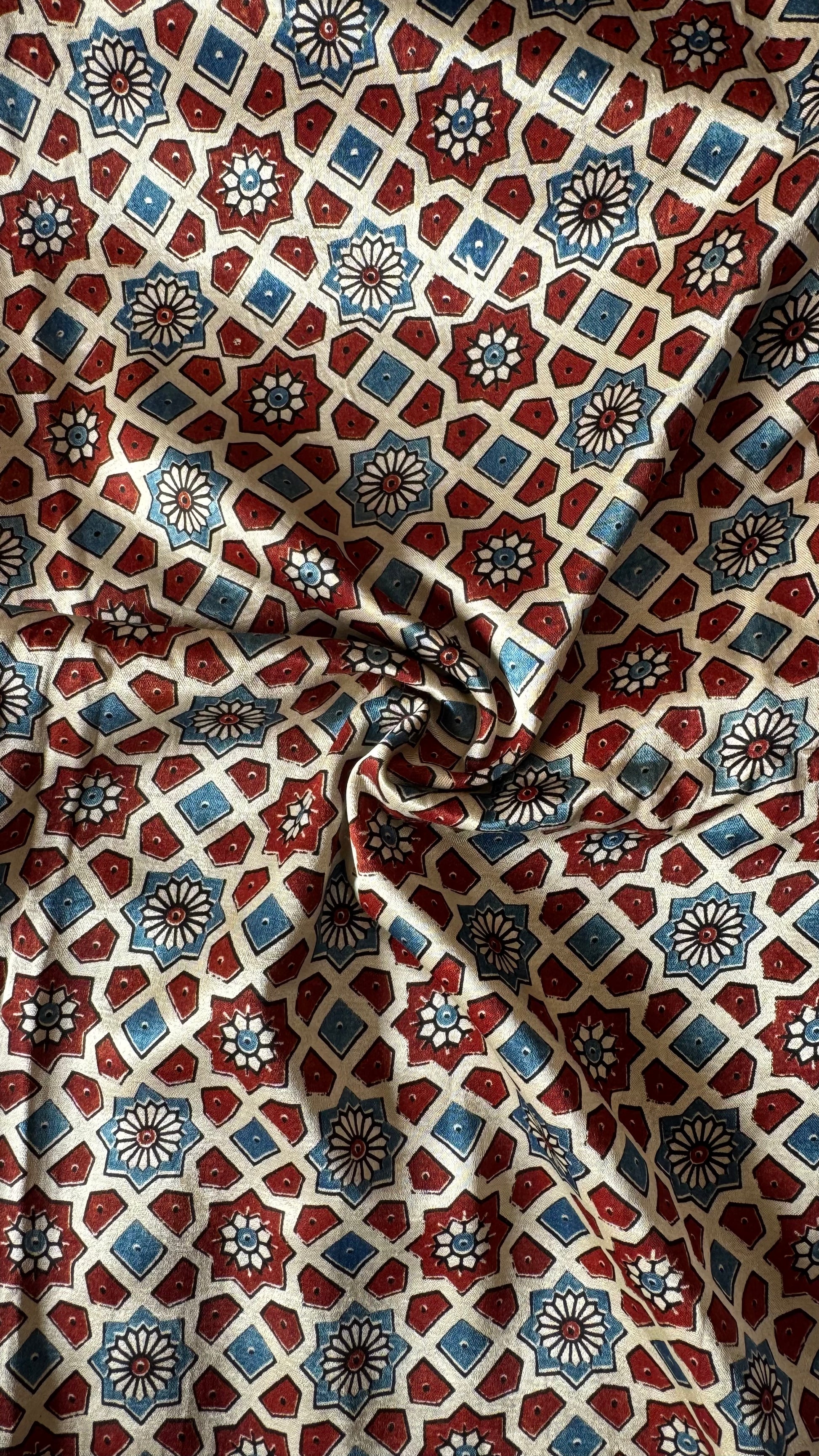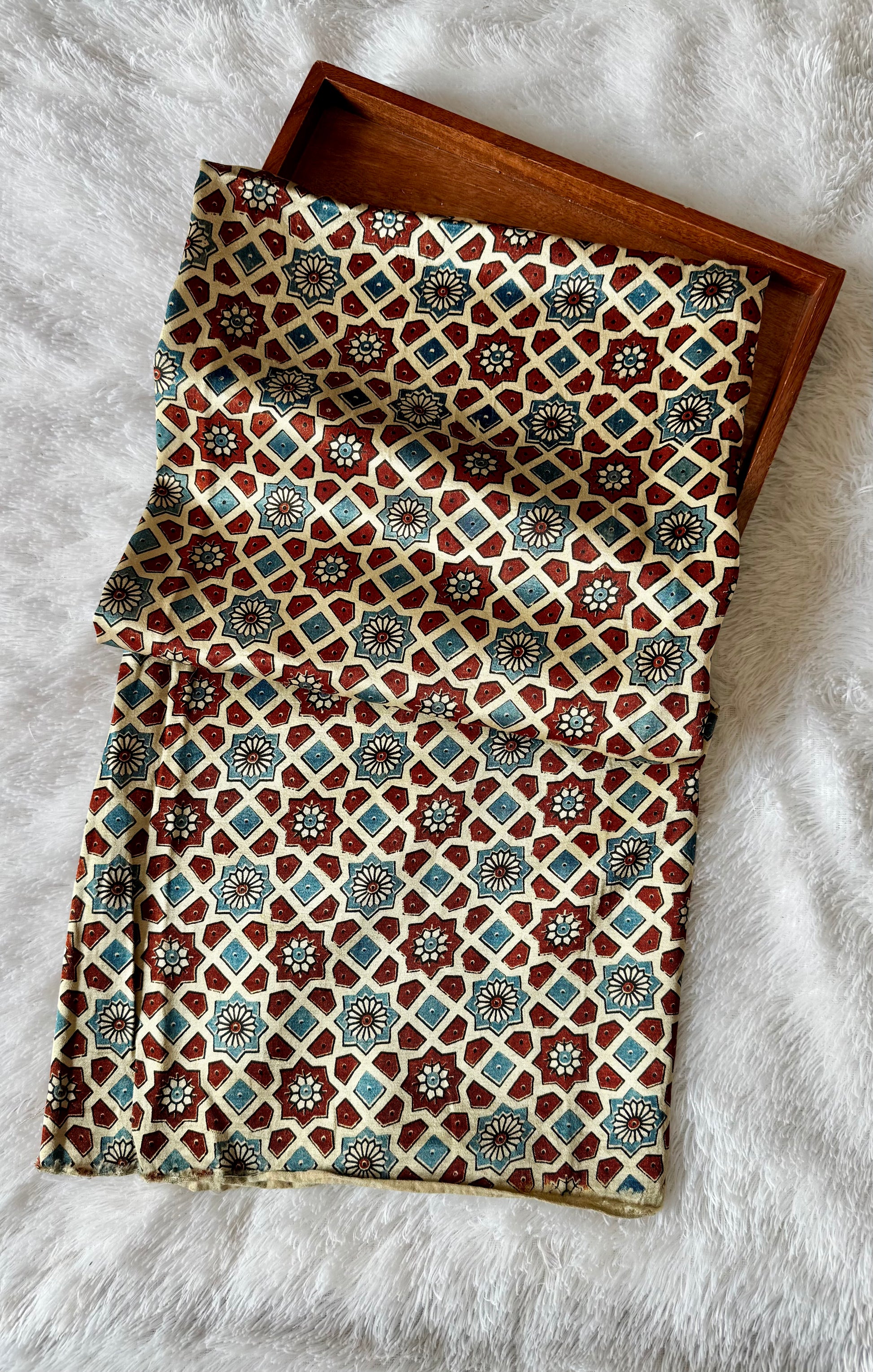 Our authentic Mashru Silk Blouse Pieces have been one of our best sellers! It is so versatile that it can be paired with a number of sarees. The vibrancy and shine of mashru silk compliments the ajrakh print, done by the tribal communities of Gujarat. The print covers the whole backside and the sleeves giving it a rich look.