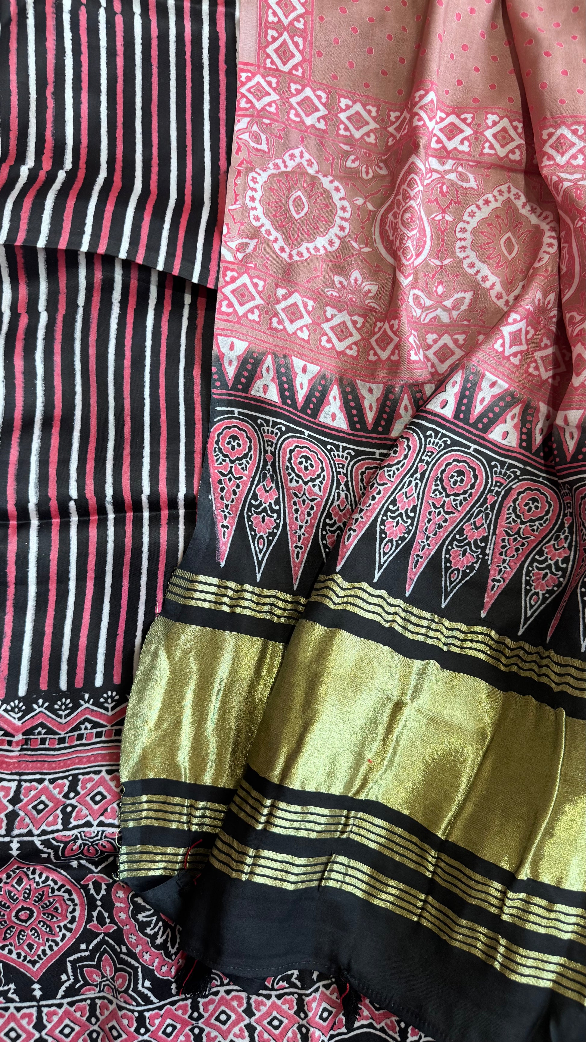 Our fine quality special Ajrakh block printed modal silk dress material set is made using natural dyes through traditional technique of handblock printing by the Khatri community practising Ajrakh Handblock technique in Kutch region of Gujarat for generations. Modal silk is a soft, shiny and highly lustrous fabric, achieved through interlacing modal fibers and silk yarns. Ajrakh Modal Silk fabric has opulence of silk and the comfort of cotton making it a very fine and soft textured weave. Thank you for choosing handmade!