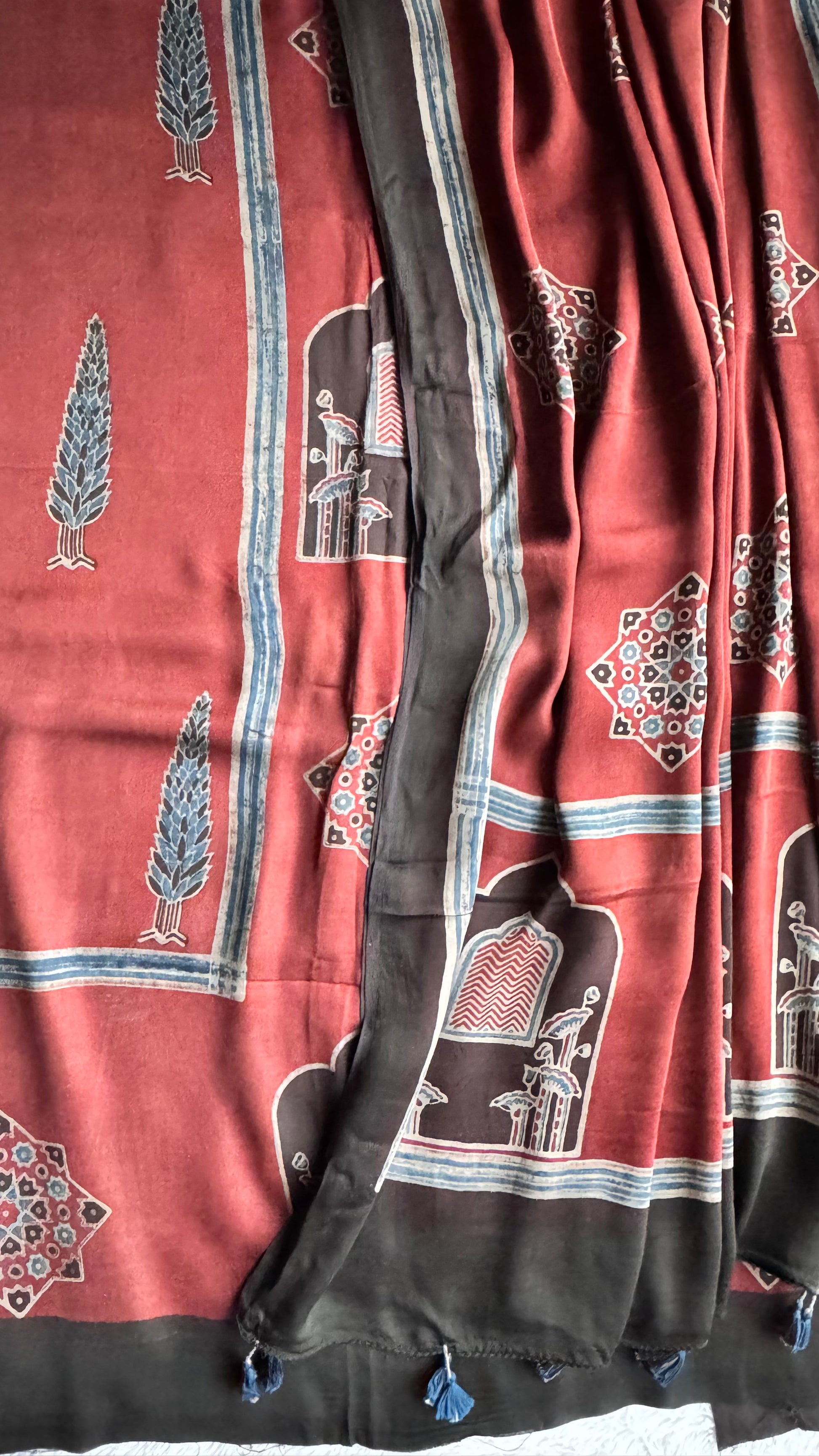 Our fine quality special Ajrakh block printed modal silk dress material set is made using natural dyes through traditional technique of handblock printing by the Khatri community practising Ajrakh Handblock technique in Kutch region of Gujarat for generations. Modal silk is a soft, shiny and highly lustrous fabric, achieved through interlacing modal fibers and silk yarns. Ajrakh Modal Silk fabric has opulence of silk and the comfort of cotton making it a very fine and soft textured weave. Thank you for choosing handmade!