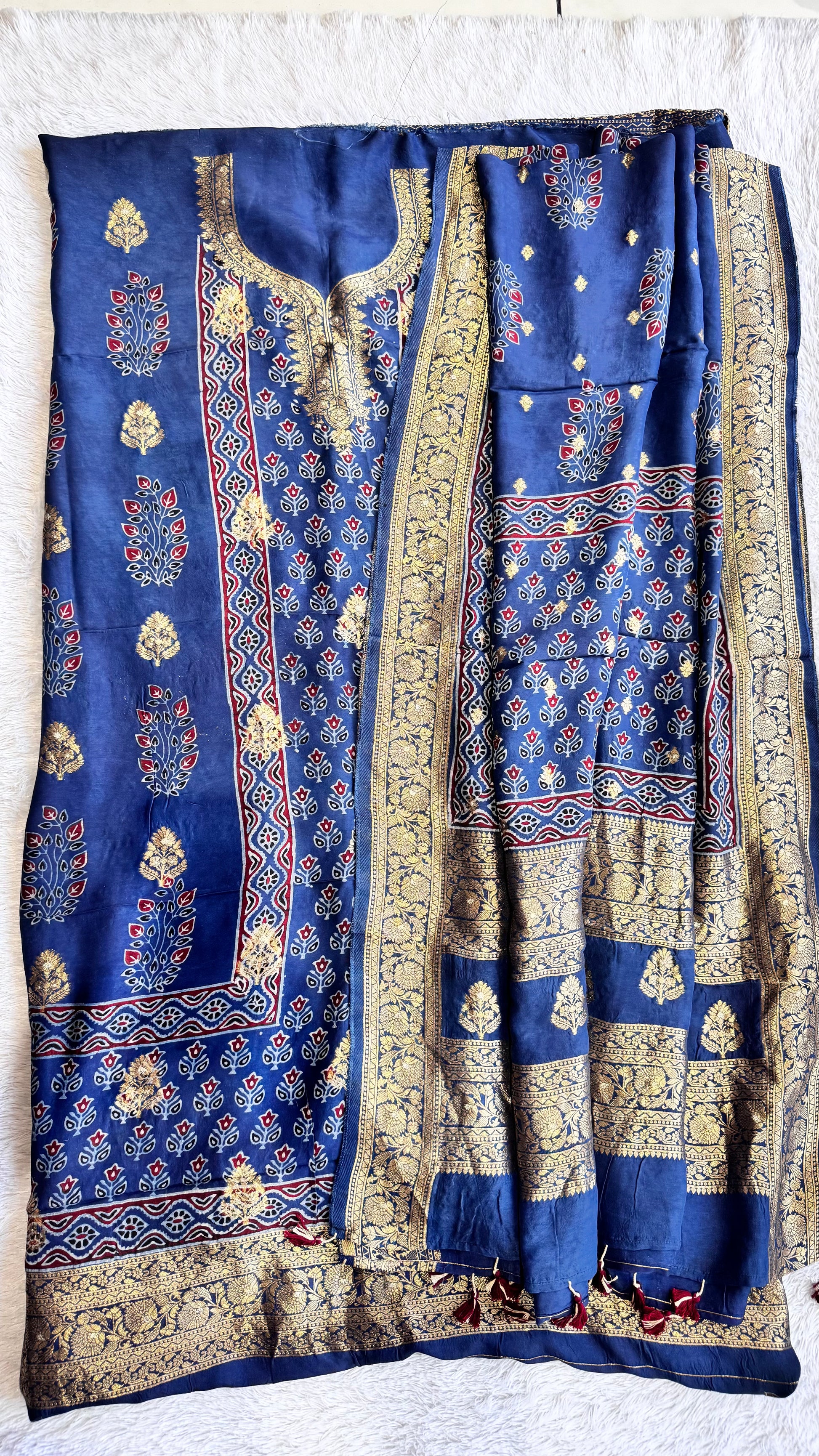Blue Mugal Buta Motif Pure Dola Silk Ajrakh Hand Block Print 2pc Suit Material Set with Zari Yoke and Nakkashi Dupatta