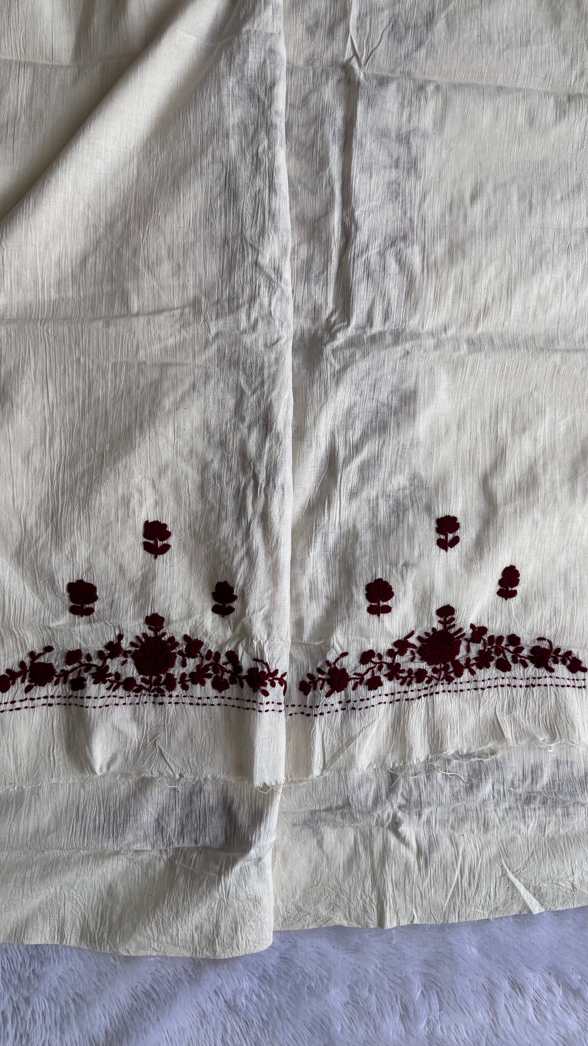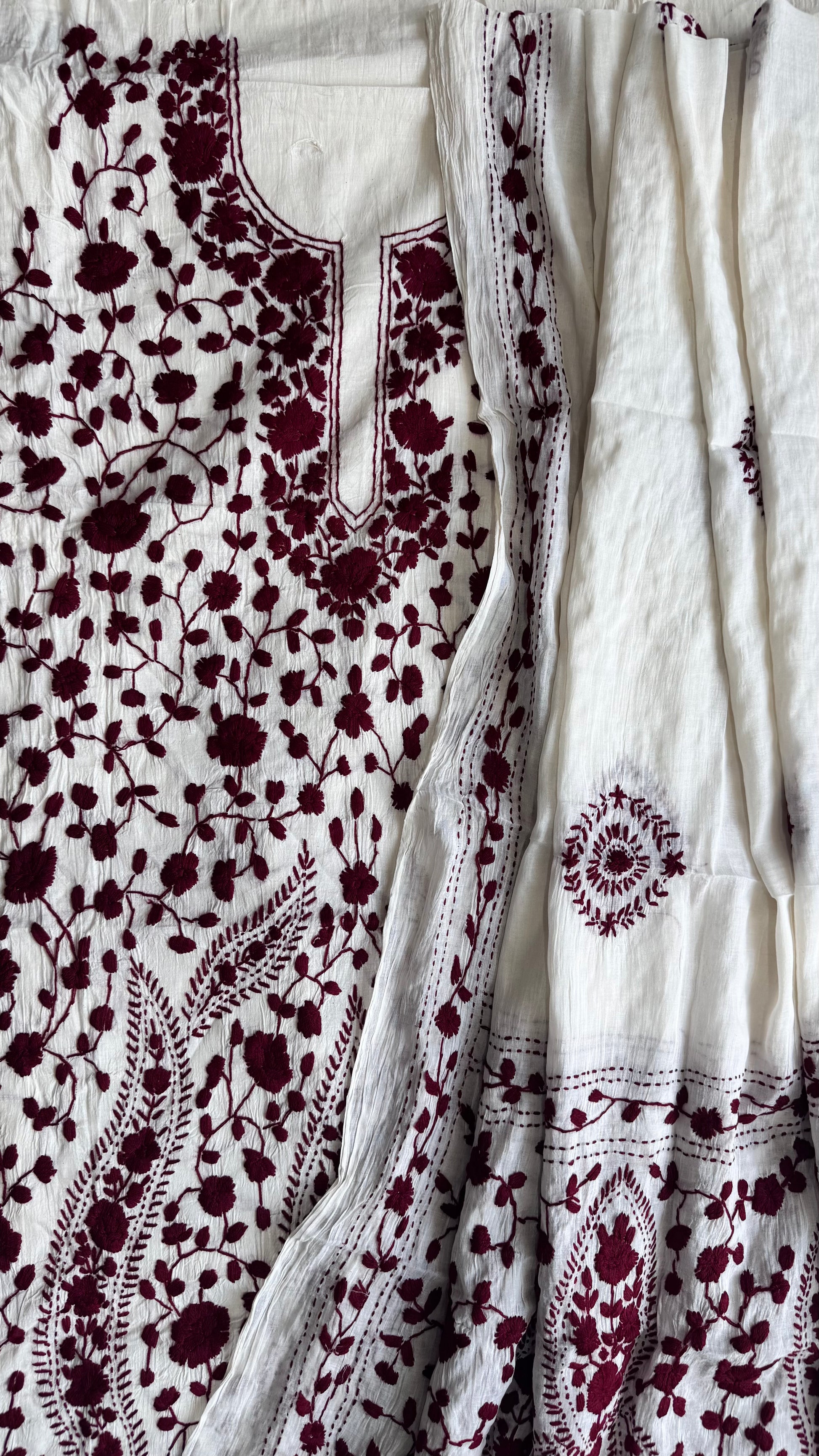 White Pure Mul Cotton 3-Piece Unstitched Suit Set with Maroon Kantha Embroidery