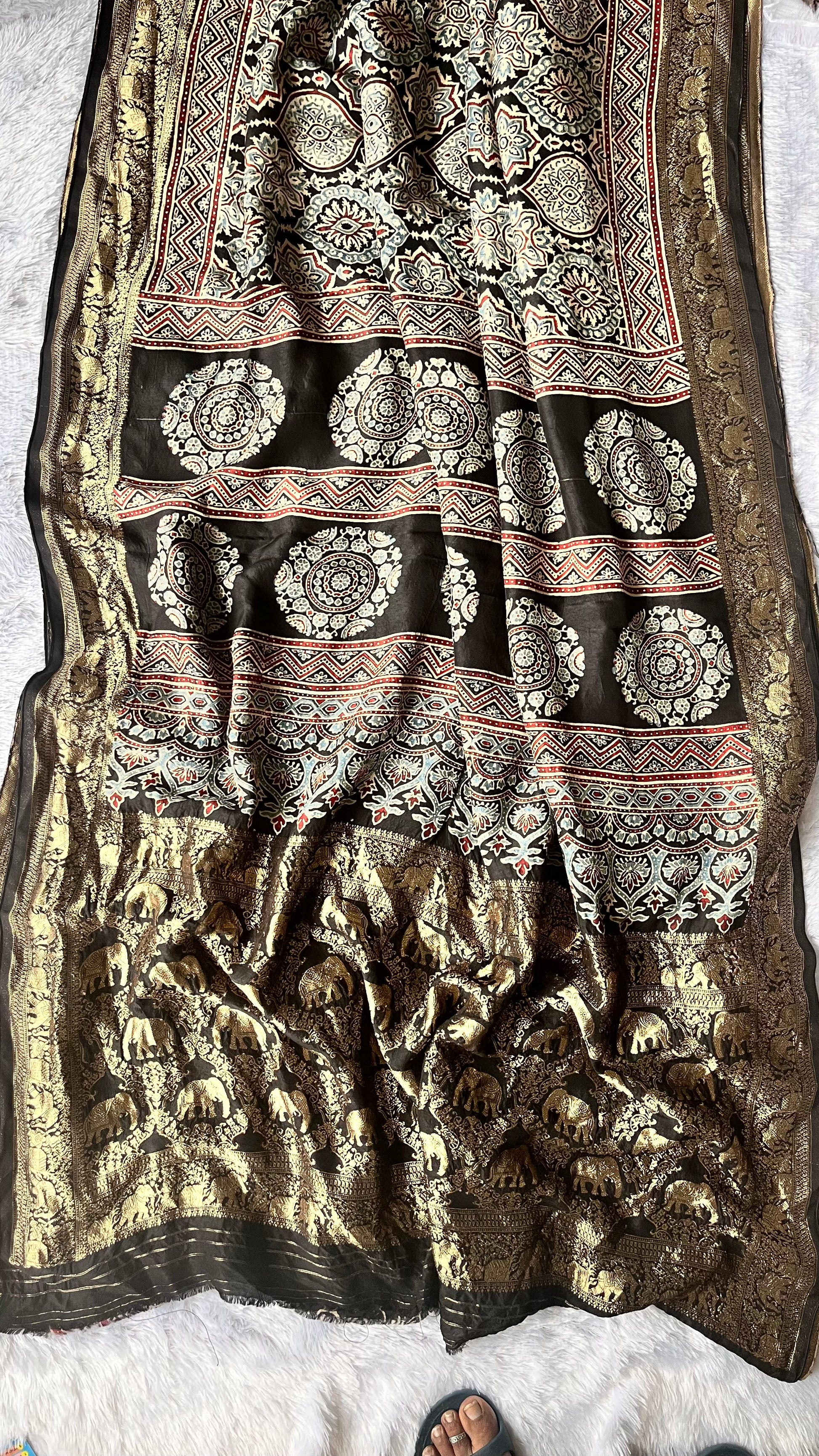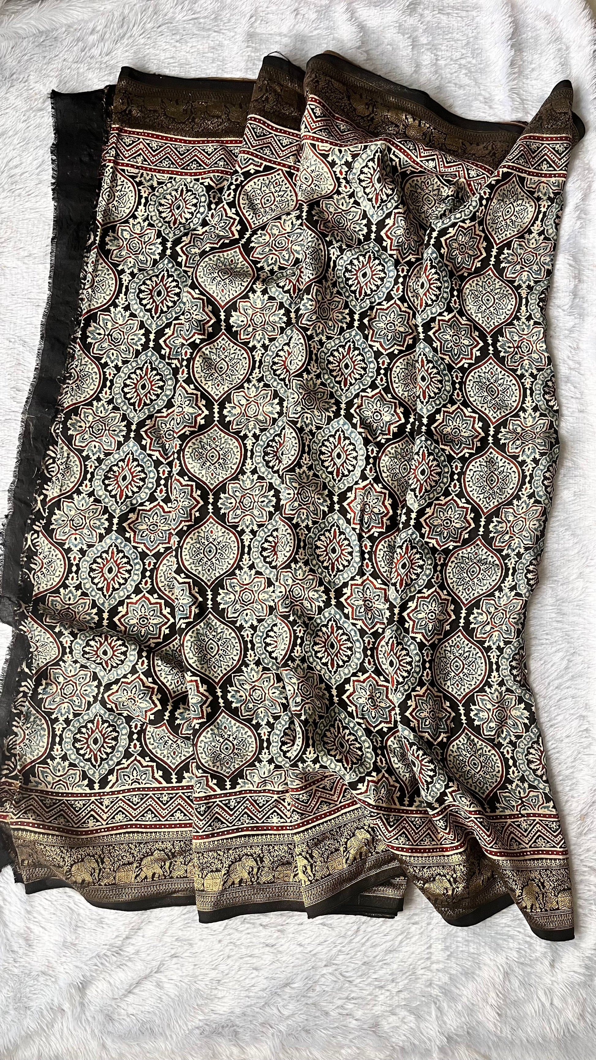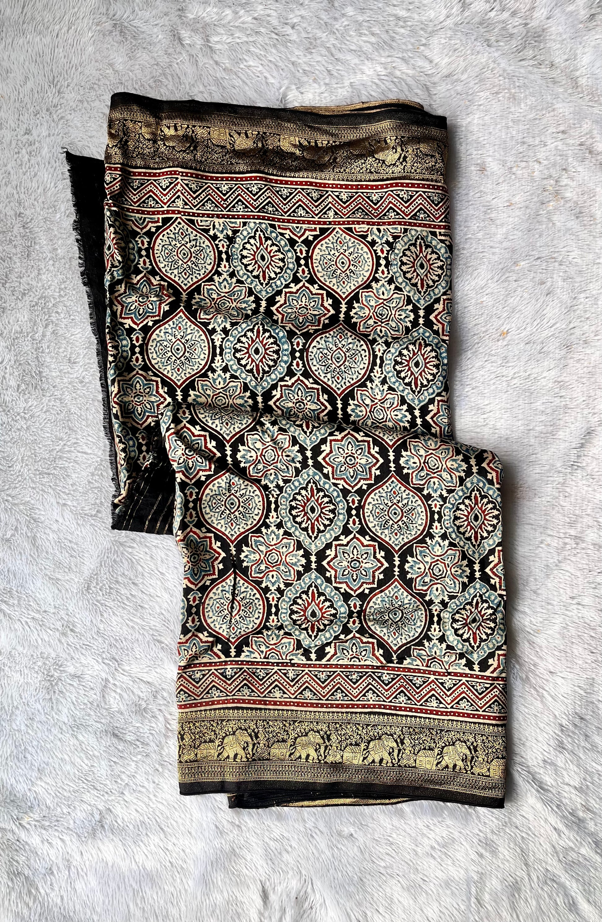 Our entrancing collection of authentic handcrafted Ajrakh modal silk sarees are an outcome of nature made with absolute love and patience. Handcrafted with vegetable dyes, the craft of Ajrakh hand-block printing is practised by the artisans in Kutch region of Gujarat. These eye pleasing modal silk ajrakh sarees immerse you with grace, poise and helps you stand out from the crowd. Each saree comes with a matching blouse piece. Thank you for looking and supporting handmade!