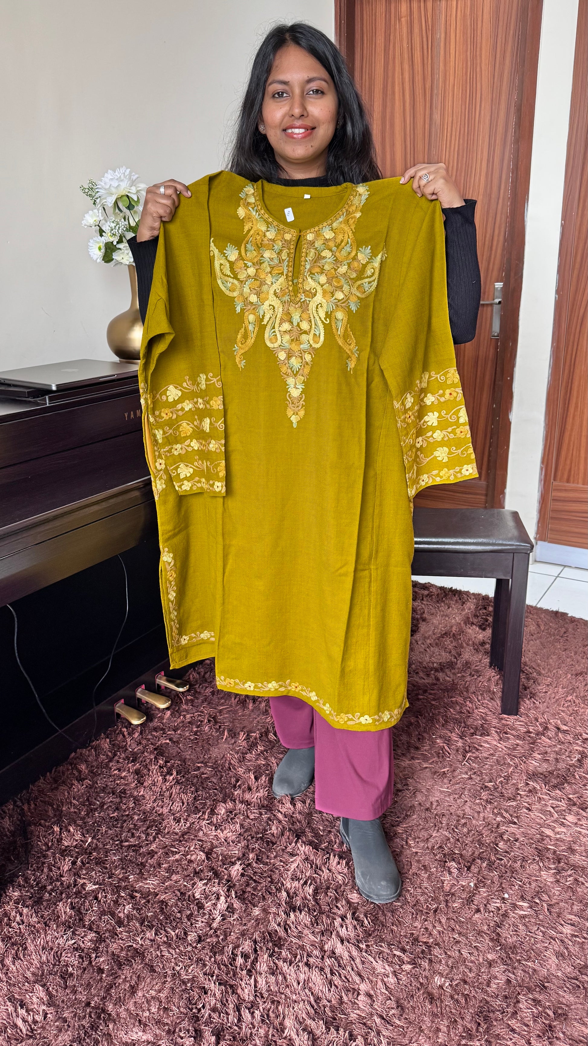 This traditional Pheran is inspired by the Kashmiri culture. It is made from the best quality of wool, with intricate aari embroidery. The unique design of this Pheran is alluring and eye catching, making it perfect for those looking for a traditional outfit that stands out from the crowd.