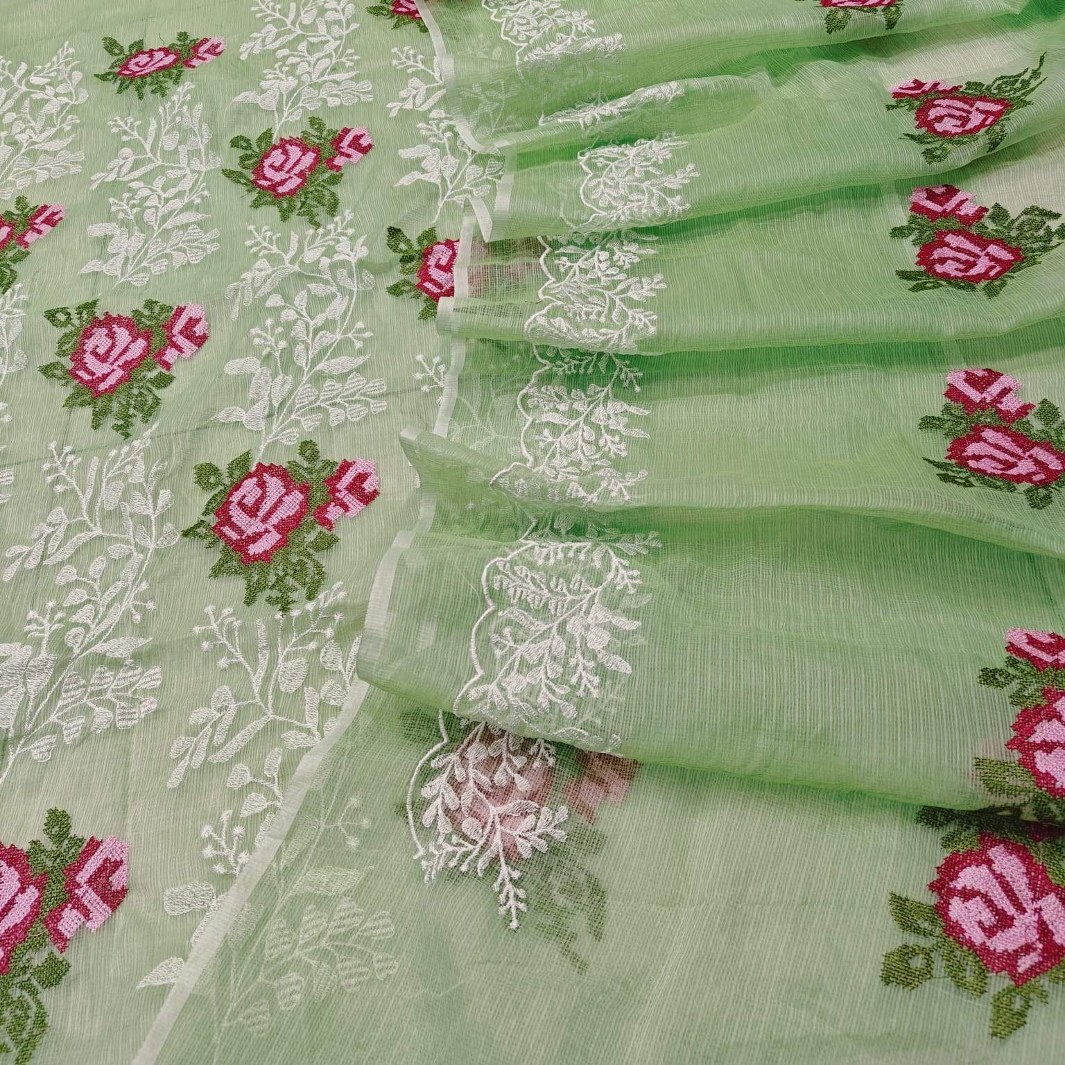 Light Mint Green Kota-Doria 3 Piece Suit Set with Cross Stitch Embroidery and Kota Doria Dupatta