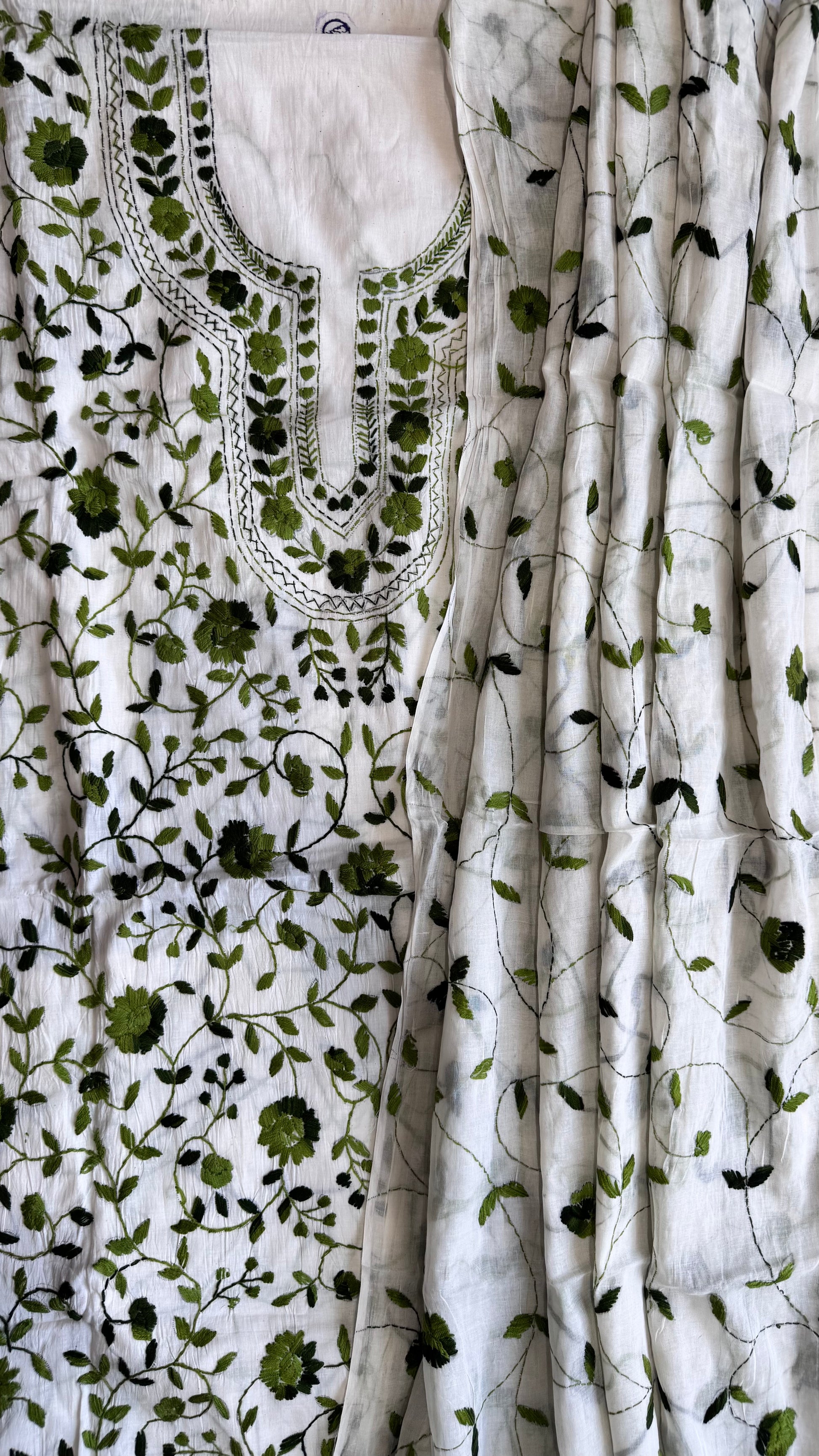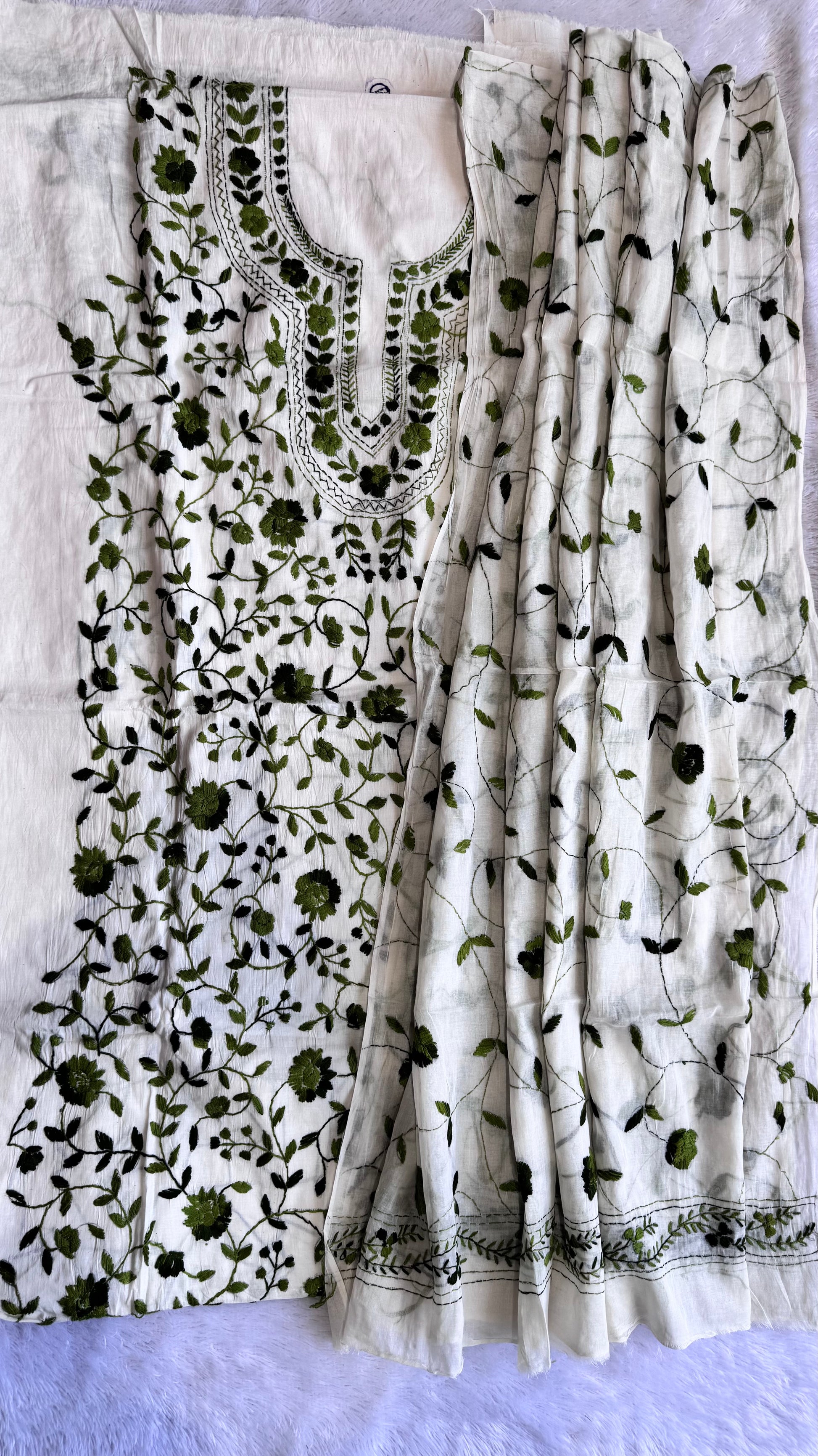 White Pure Mul Cotton 3-Piece Unstitched Suit Set with Green Kantha Embroidery